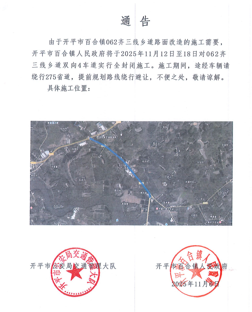 由于開平市百合鎮(zhèn)062齊三線鄉(xiāng)道路面改造的施工需要,開平市百合鎮(zhèn)人民政府將于2025年11月12日至18日對062齊三線鄉(xiāng)道雙向4車道實(shí)行全封閉施工。施工期間,途經(jīng)車輛請繞行275省道,提前規(guī)劃路線繞行避讓,不便之處,敬請諒解。