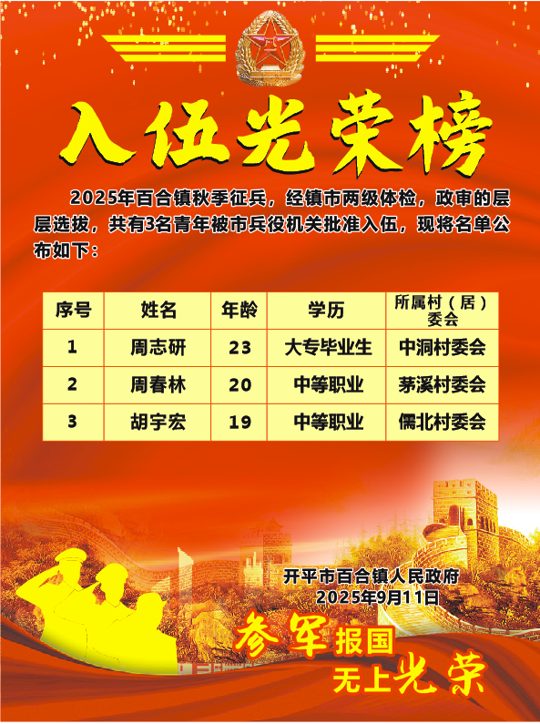 2025年秋季征兵工作開展以來,百合鎮(zhèn)廣大適齡青年積極響應(yīng)祖國號召,踴躍報名參軍,經(jīng)過嚴(yán)格挑選、層層把關(guān),共有3名優(yōu)秀青年被批準(zhǔn)入伍,將分批啟程奔赴軍營。
