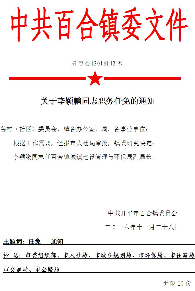 關于李穎鵬同志職務任免的通知【開百委[2016]42號】