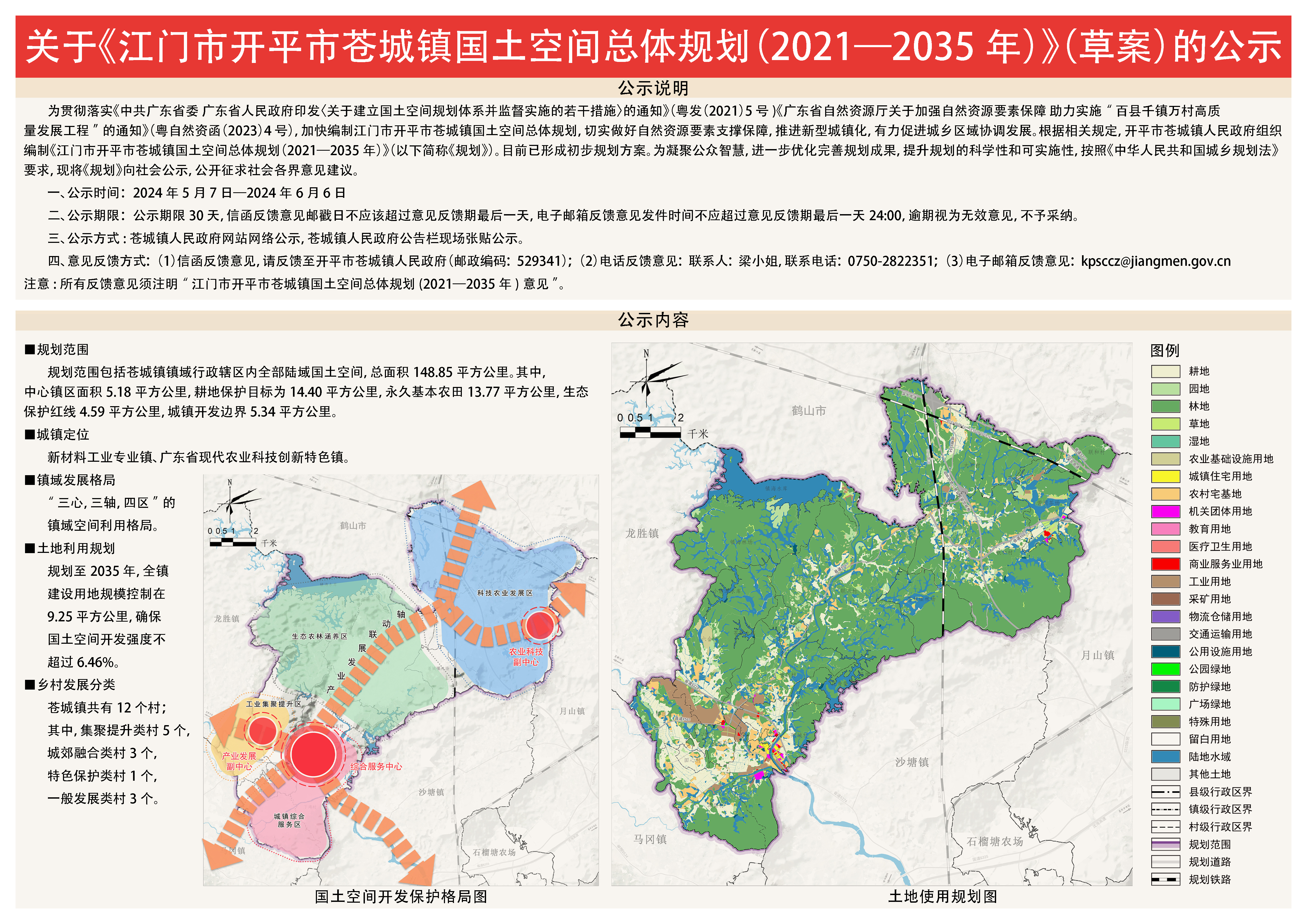 意見反饋方式: (1)信函反饋意見,請反饋至開平市蒼城鎮(zhèn)人民政府,郵政編碼:529341; (2)電話反饋意見:聯(lián)系人:梁小姐;聯(lián)系電話:0750-2822351; (3)電子郵箱反饋意見:kpsccz@jiangmen.gov.cn 注意:所有反饋意見須注明“江門市開平市蒼城鎮(zhèn)國土空間總體規(guī)劃(2021—2035年)意見” 附件:關(guān)于《江門市開平市蒼城鎮(zhèn)國土空間總體規(guī)劃(2021—2035年)》(草案)的公示 開平市蒼城鎮(zhèn)人民政府 2024年5月7日