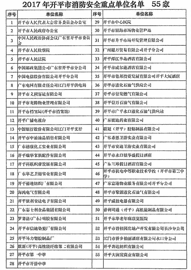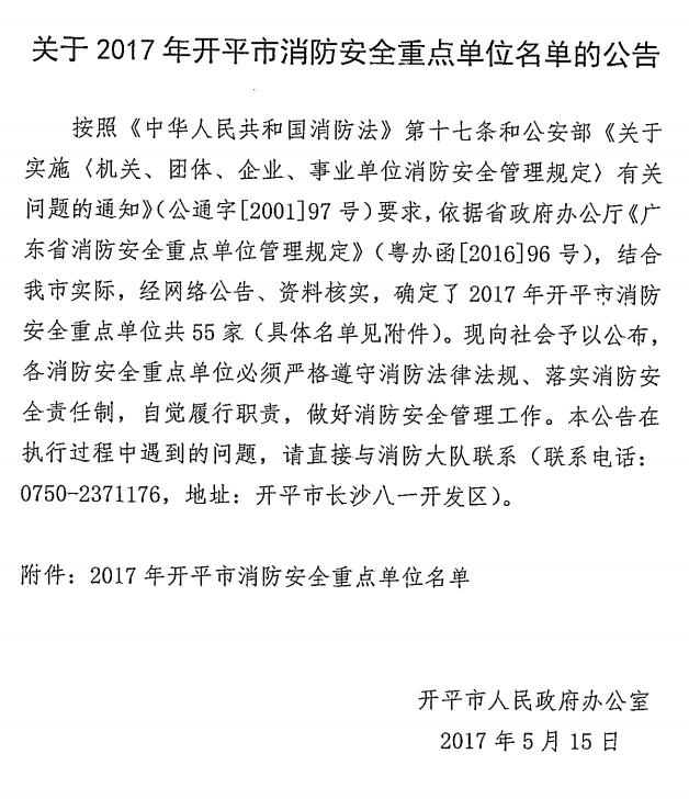 關于2017年開平市消防安全重點單位名單的公告