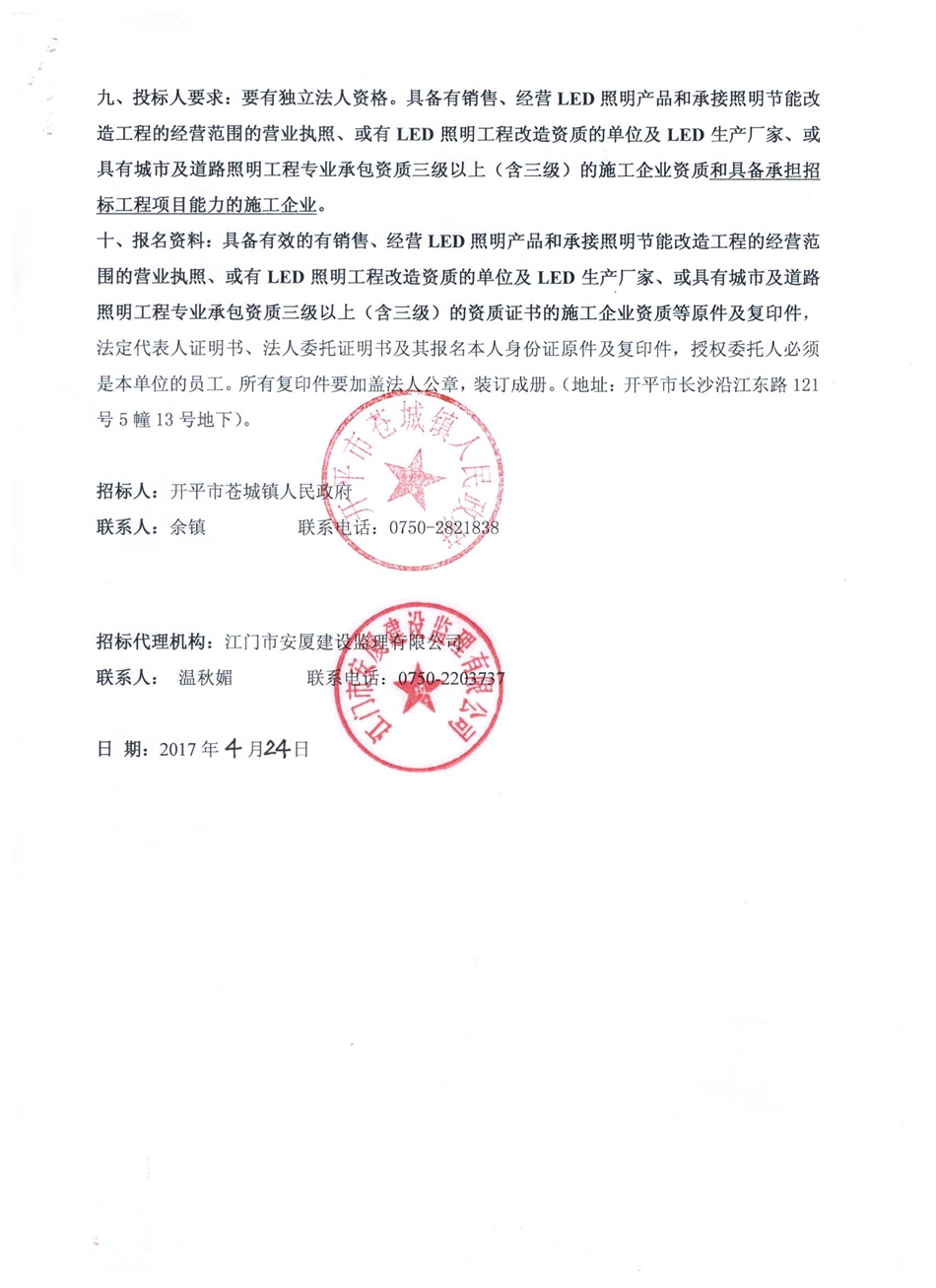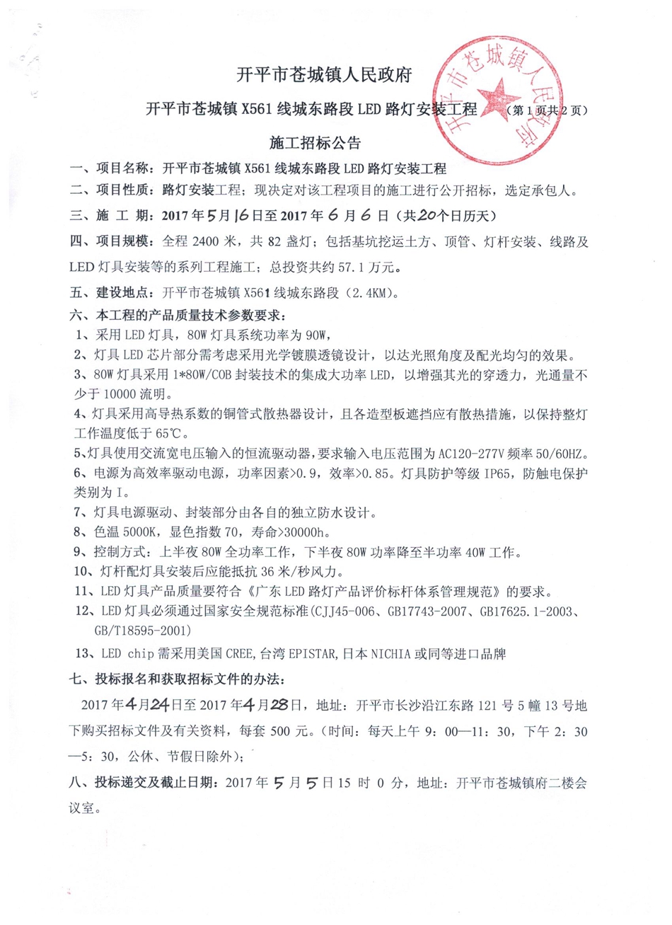 開平市蒼城鎮X561線城東路段LED路燈安裝工程施工招標公告
