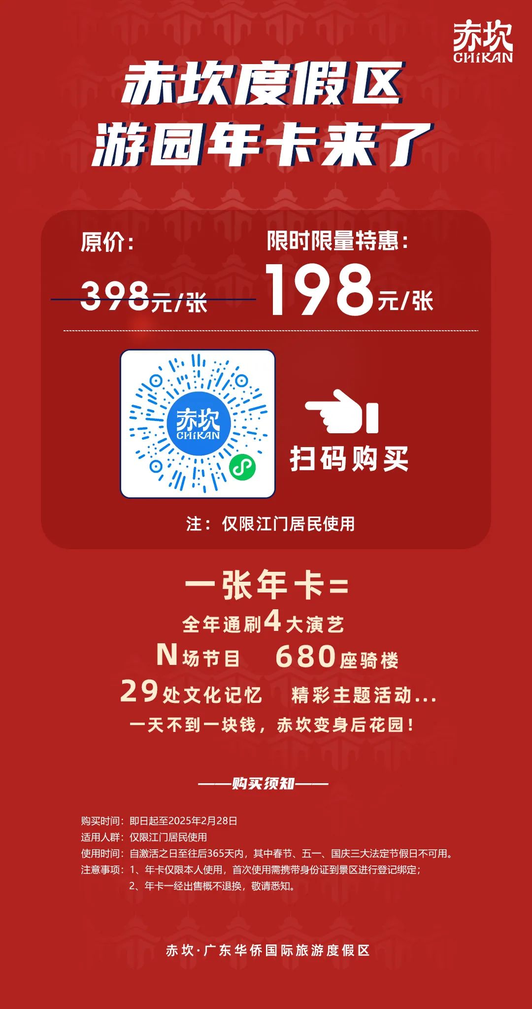 購買時間:即日起至2025年3月31日; 使用時間:即日起至2025年3月31日; 兒童使用標準:身高1.2-1.5米(含)或16周歲(含)以下。 節后還能看什么?玩什么? 年卡到底值不值?請看—— 剛剛過去的春節 赤坎再登央視、全網刷屏 從年初一火到年初七 節后的赤坎,又將是另一種體驗—— 看劇不用排隊,拍照不用避人群 從街頭吃到巷尾,慢逛細賞每座騎樓 如留宿騎樓酒店,一不小心還能包園 一張年卡能帶你去看—— 歸途 The Return 百年赤坎變遷簡史,萬千華僑榮光再現 給赤坎50分鐘,還你一個黃金時代。 火秀 fire show 富有盛譽的王牌演藝 打鐵花、煙花、舞火龍一次看到爽! 摩登時代 Modern Times 景區唯一純西式歌舞表演 全程高能狂歡的海上百老匯 特別的婚禮 Speciel Wedding 回到赤坎的每個人 都是這場特別的婚禮的證婚人 從騎樓下到江畔,隨時隨地能入戲 在《南樓!南樓!》看英雄歷史 在《豪門有戲》加入1926的歌舞派對 都看過了?沒關系! 正在上映的演藝會不斷進化 可能每一次都會發現新細節! 今年還有新劇登臺嗎? 噓——敬請期待。 去年的赤坎怪誕夜、奇妙童話夜 多次出圈,連續數月引爆社媒 今年還會有哪些精彩活動呢? 悄悄劇透—— 人氣NPC返場、新頂流上線 超出片打卡地、煙花派對…… 情人節與元宵節活動即將上線 還有清明節、復活節、端午節 暑期嘉年華、萬圣、圣誕…… 敬請期待~ 靈通電話公司、發明電燈公司 關光裕碉樓、靈通電話公司… 680多座騎樓,29處文化記憶 帶你親歷黃金年代! 是的,今年赤坎玩法更豐富了 鬼屋、密室逃脫 兒童樂園、非遺手作 特色文創、本地美食 霧海游船、主題鐺鐺車 奇幻夜景、節日美陳、中西換裝… 應有盡有,還沒有的也在路上了 01 198元買年卡劃算嗎? 門票單價為150元,即第二次入園為3.2折,第三次玩開始無限免費,屬于應玩盡玩、大薅特薅! 02 只有江門人才能買年卡嗎?特惠價到什么時候呀? (1)目前年卡使用對象僅限江門地區居民,每人限購一張; (2)特惠年卡購買時間:即日起至2025年2月28日; (3)年卡一經激活概不退換,敬請悉知。 03 如何購買年卡呀? (1)在購票處現場購買; (2)點擊年卡進入小程序,再點擊「票務」-「門票年卡」購買; (3)在抖音、美團、攜程等官方線上店鋪購買; 04 買了之后如何使用? 購買年卡后,首次使用需進行激活人臉識別;擁有江門地區身份證的居民可攜帶本人身份證前來景區售票中心辦理激活;如擁有江門地區在住戶口或暫住證的居民,亦可攜帶本人戶口本+本人身份證/本人暫住證+本人身份證到景區售票中心進行登記個人信息辦理激活,激活后以人臉識別的方式入園游玩。 05 年卡使用時間有限制嗎? 激活期限:2025年4月30日21:30前,超過期限仍未激活則無法再使用; 使用期限:自激活日起至往后365天內; 不適用日期:三大法定節假日不可使用:勞動節(2025.5.1-5.4)與國慶(2025.10.1-10.7)、春節(2026.2.17-2.24) 06 小朋友有年卡優惠嗎? 1.2米以下的小朋友是免票進入景區滴,高于1.2米的小朋友就要像大朋友一樣購買年卡啦。 07 年卡可以給別人用嗎? 不可以哦,年卡使用方式為人臉識別入園,僅限本人使用~ 一天不到一塊錢,赤坎變身后花園! 工作累了,進來散散步 躺無聊了,進來看看劇 不高興了,進來坐在江邊發個呆 想不到晚飯吃什么,進來隨便選 朋友圈不知道發啥,歡迎四季都來打卡