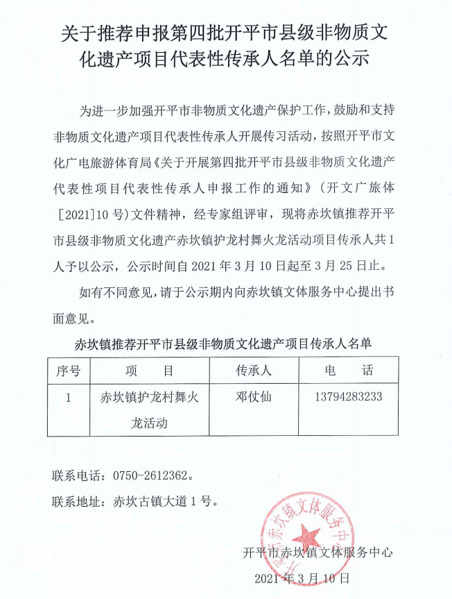 關于推薦申報第四批開平市縣級非物質文化遺產項目代表性傳承人名單的公示