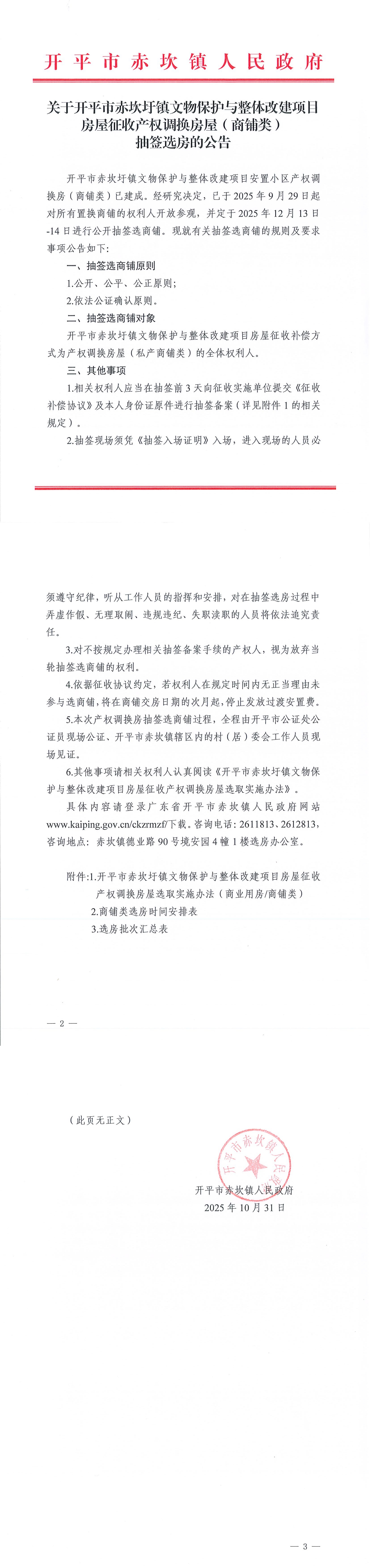 開平市赤坎圩鎮(zhèn)文物保護(hù)與整體改建項目安置小區(qū)產(chǎn)權(quán)調(diào)換房(商鋪類)已建成。經(jīng)研究決定,已于2025年9月29日起對所有置換商鋪的權(quán)利人開放參觀,并定于2025年12月13日-14日進(jìn)行公開抽簽選商鋪。現(xiàn)就有關(guān)抽簽選商鋪的規(guī)則及要求事項公告如下: