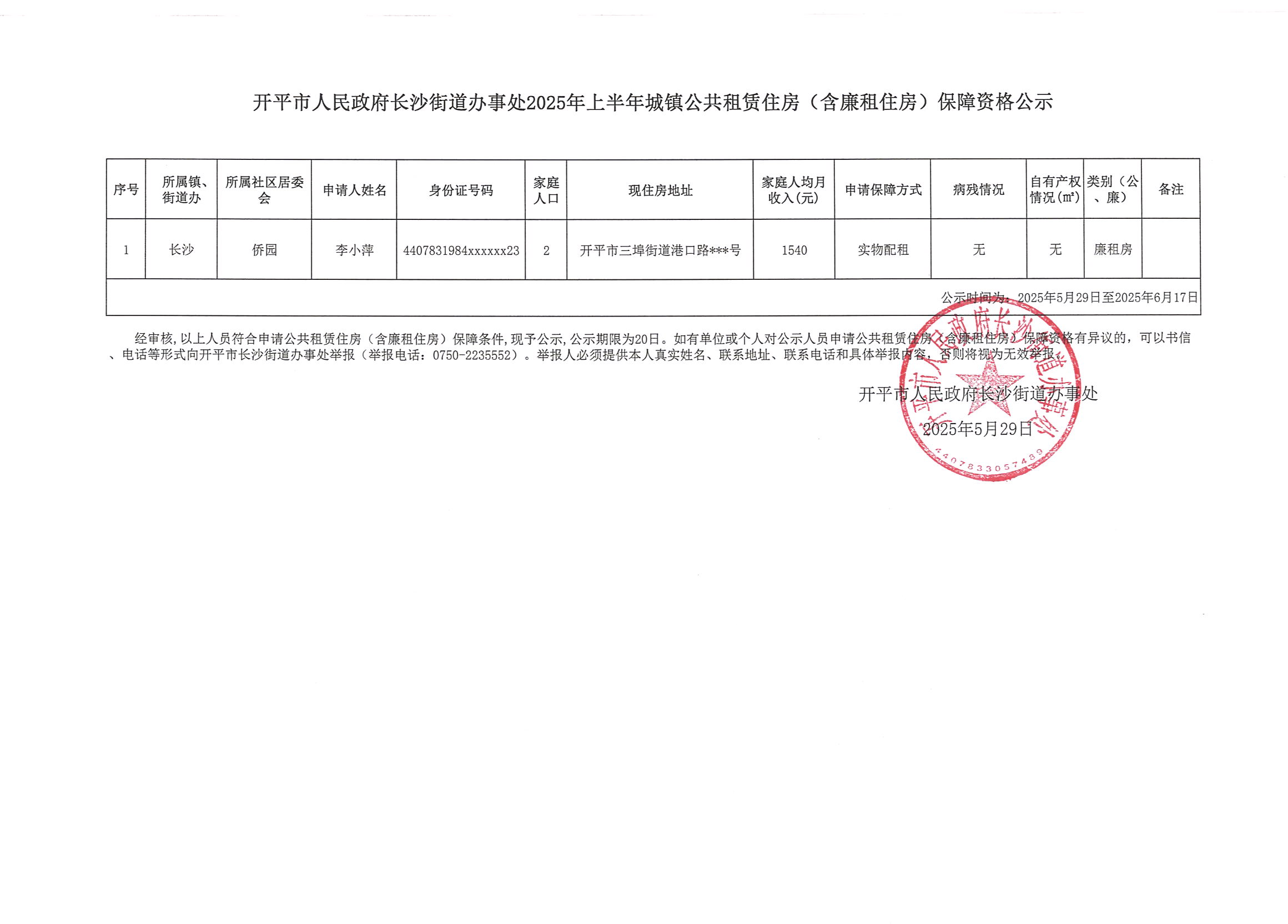 開平市人民政府長沙街道辦事處2025年上半年城鎮公共租賃住房(含廉租住房)保障資格公示