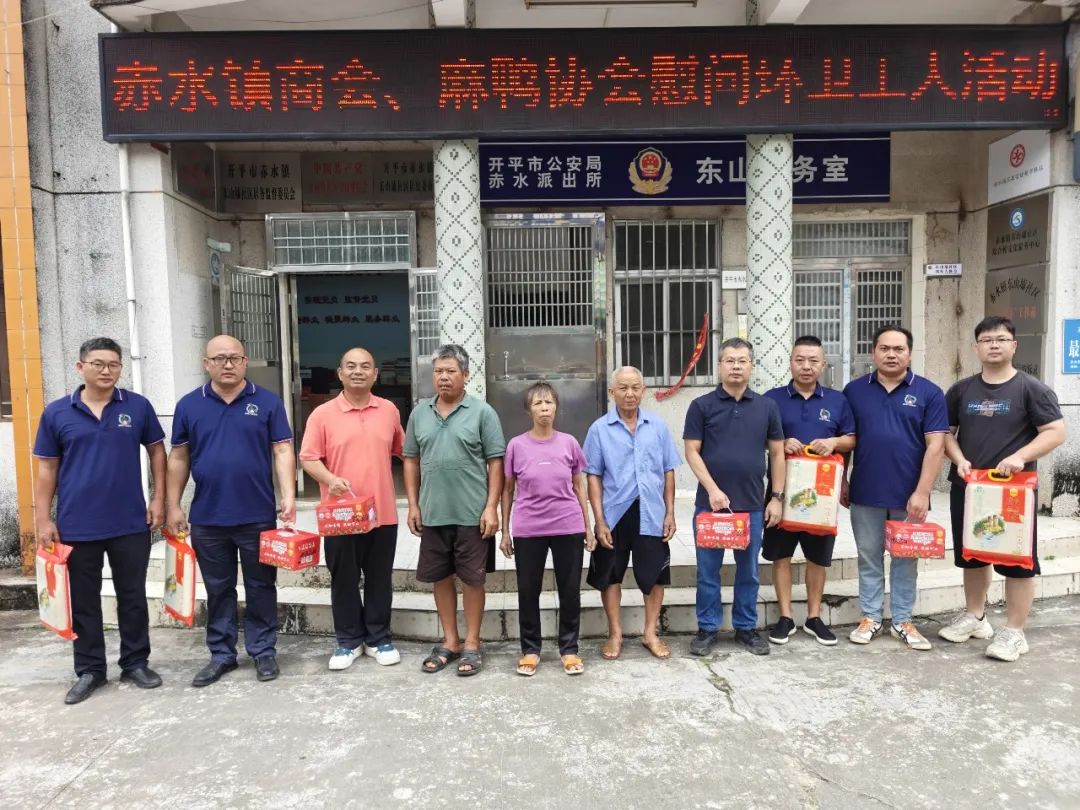 持續高溫給環衛工作帶來嚴峻“烤”驗,8月14日上午,赤水鎮聯合鎮商會、開平市麻鴨產業協會開展“送清涼”慰問活動,向全鎮20余名一線環衛工人贈送“赤水優品”禮包(含山楂醋、大米等物資)。黃大勇、張曉冉以及麻鴨產業協會會長、商會代表樊勁松等參加慰問。