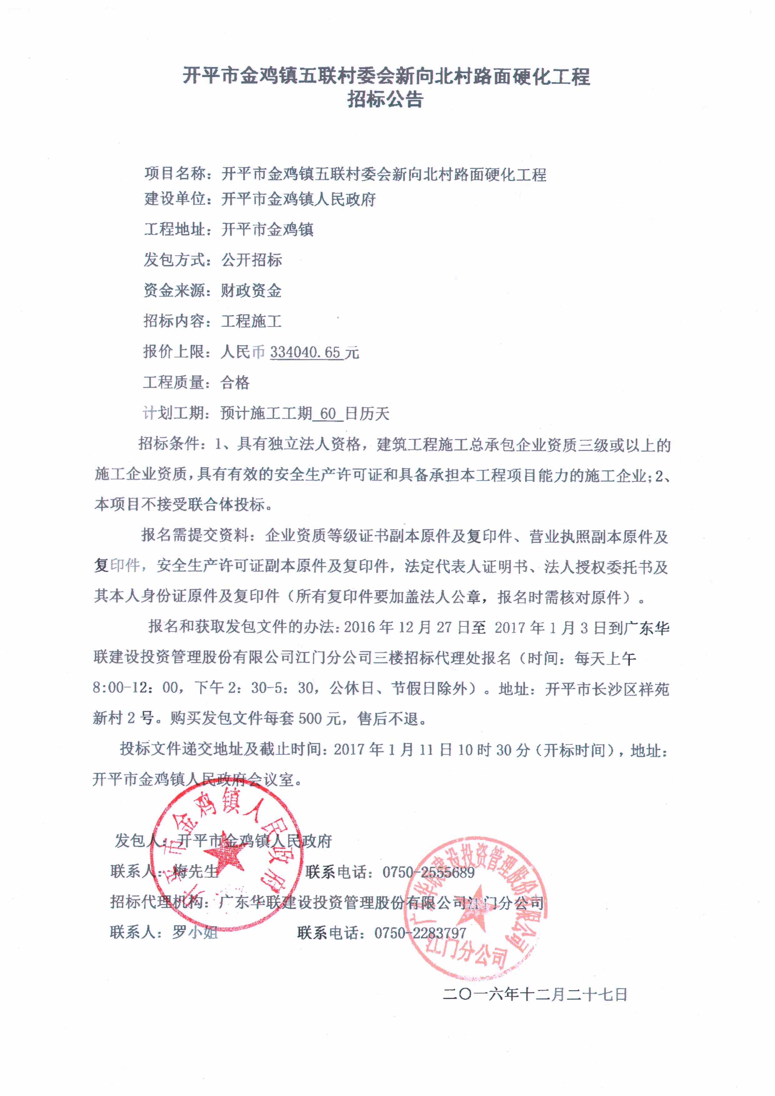 開平市金雞鎮五聯村委會新向北村路面硬化工程招標公告