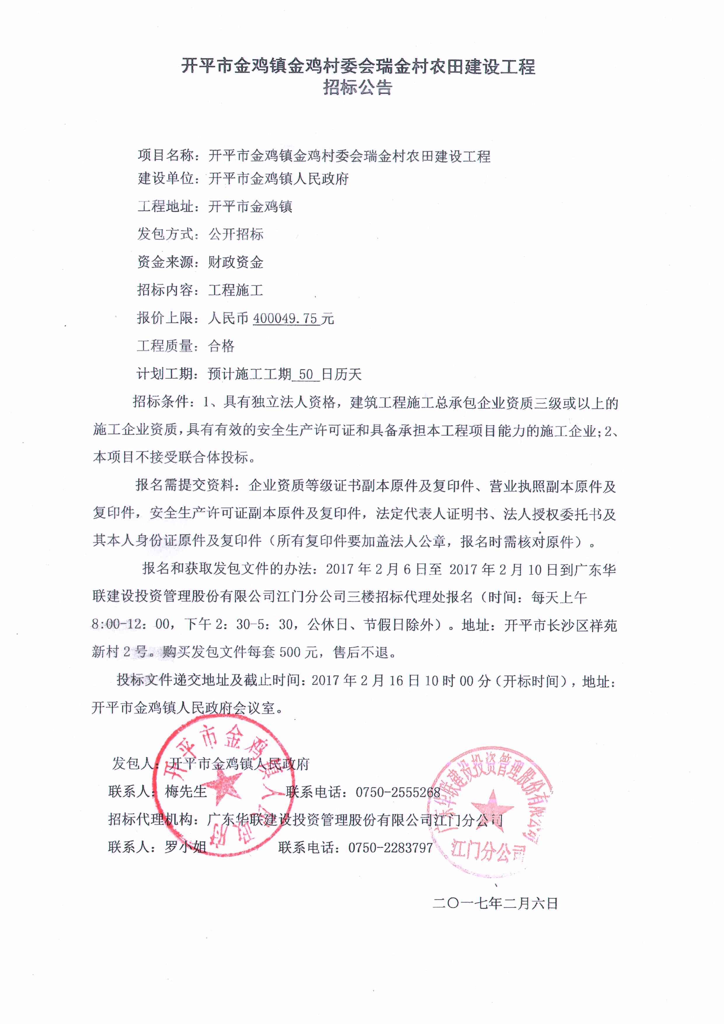 開平市金雞鎮金雞村委會瑞金村農田建設工程招標公告