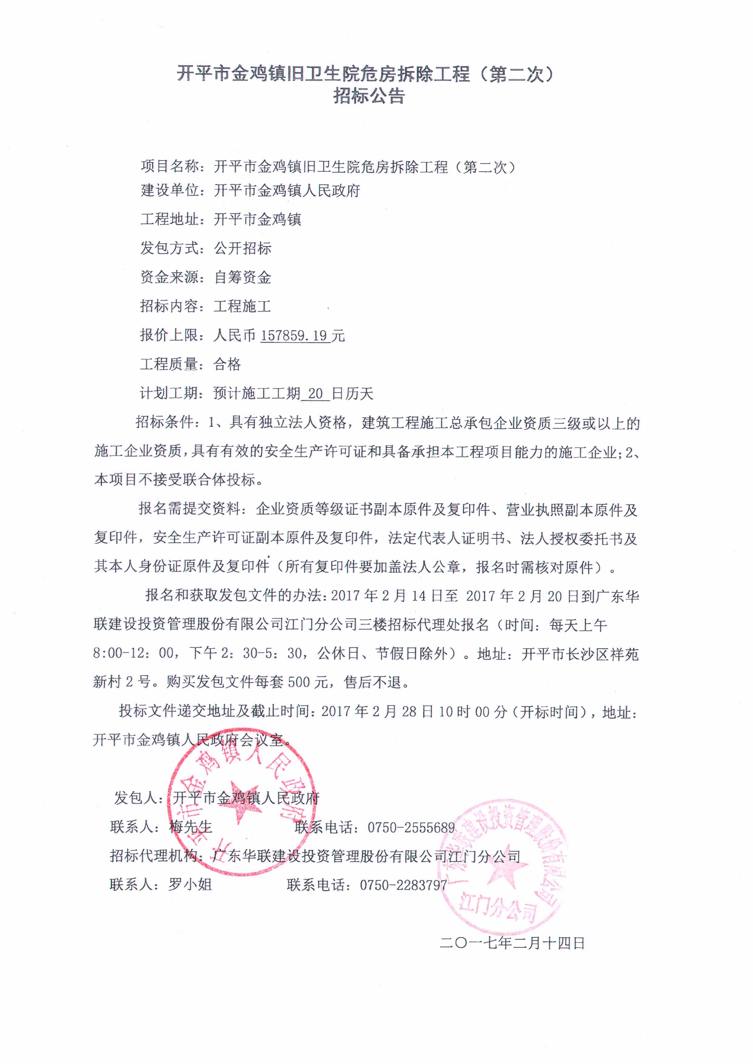 開平市金雞鎮(zhèn)舊衛(wèi)生院危房拆除工程招標(biāo)公告(第二次)