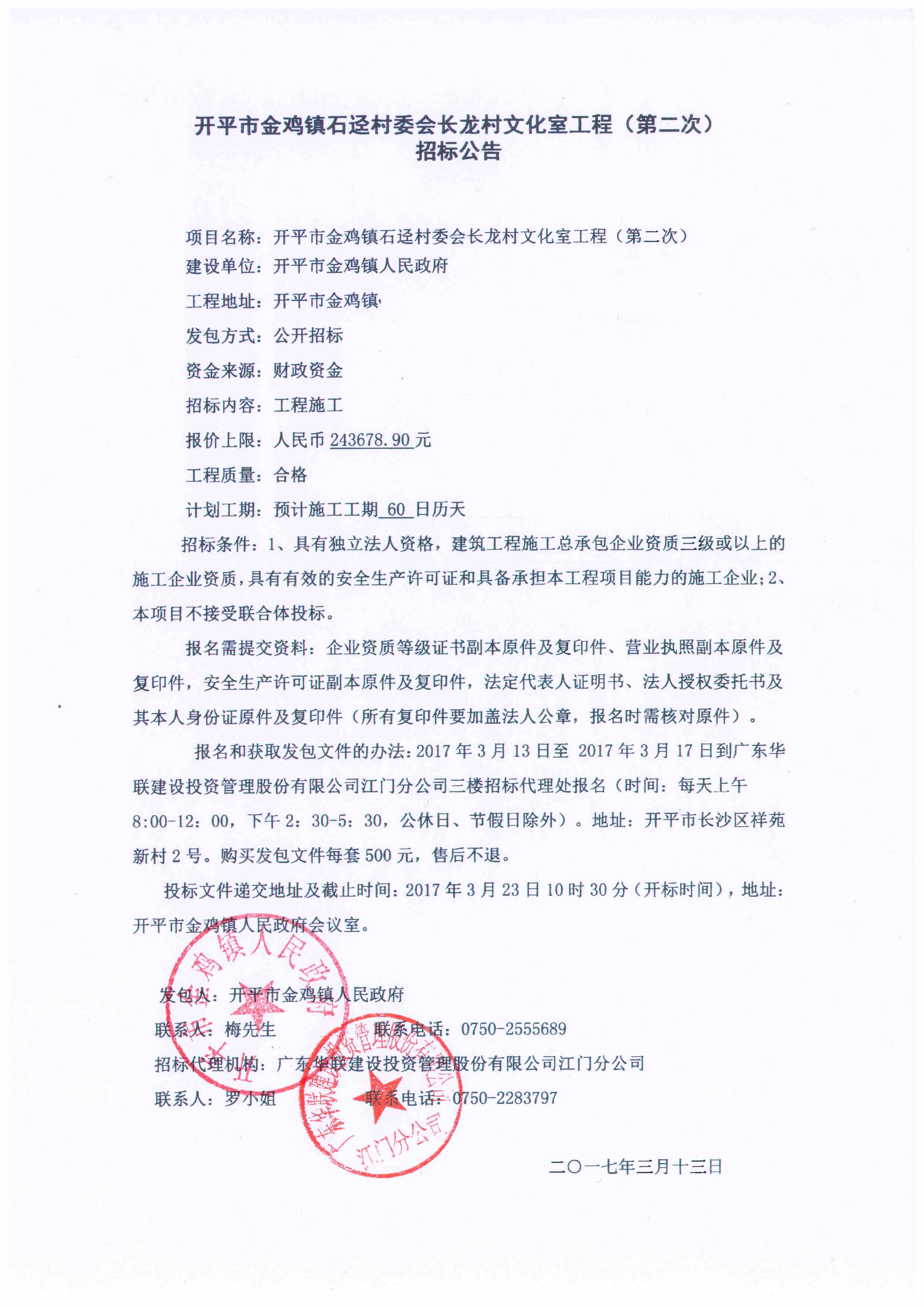 開平市金雞鎮(zhèn)石逕村委會長龍村文化室工程(第二次)