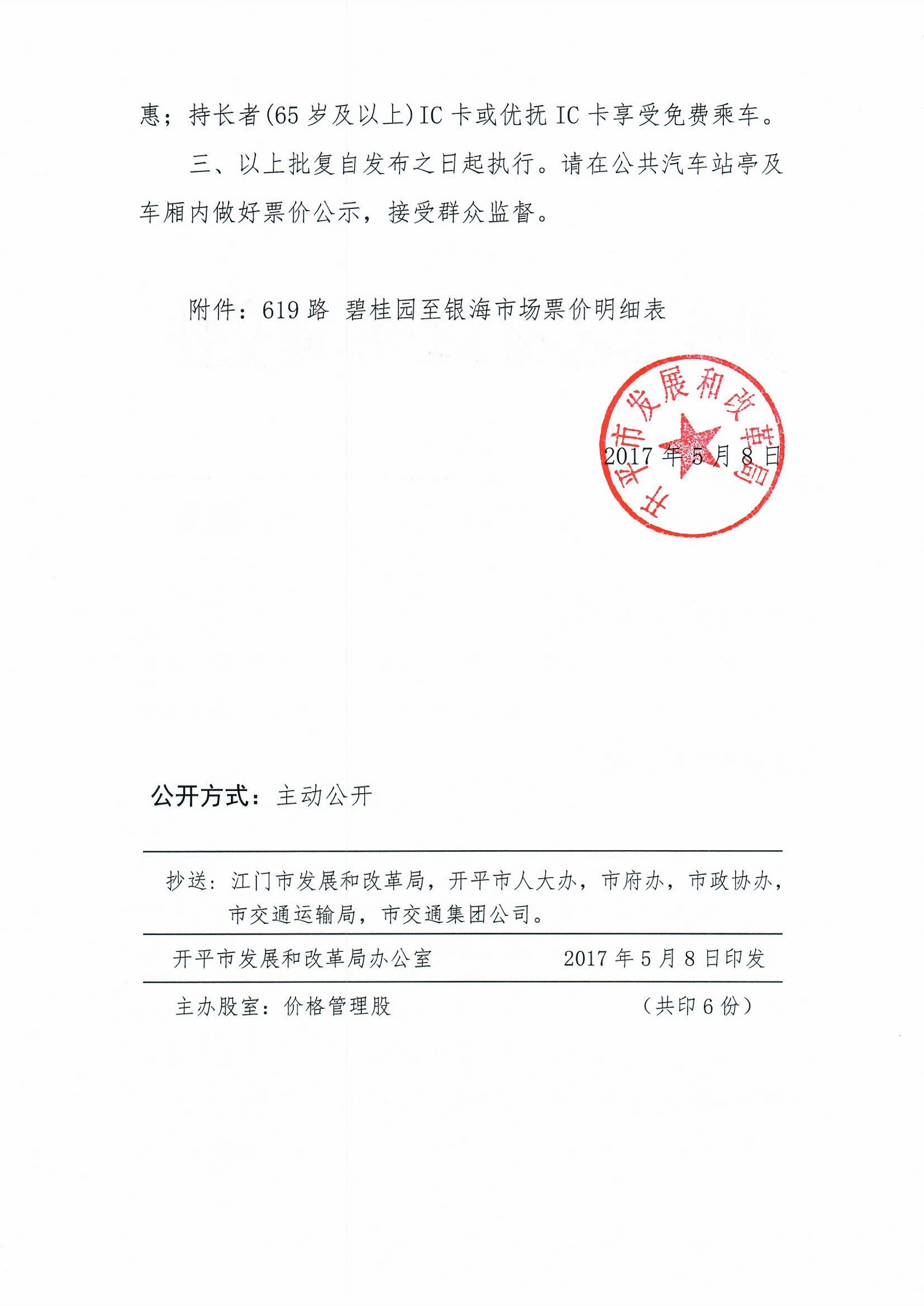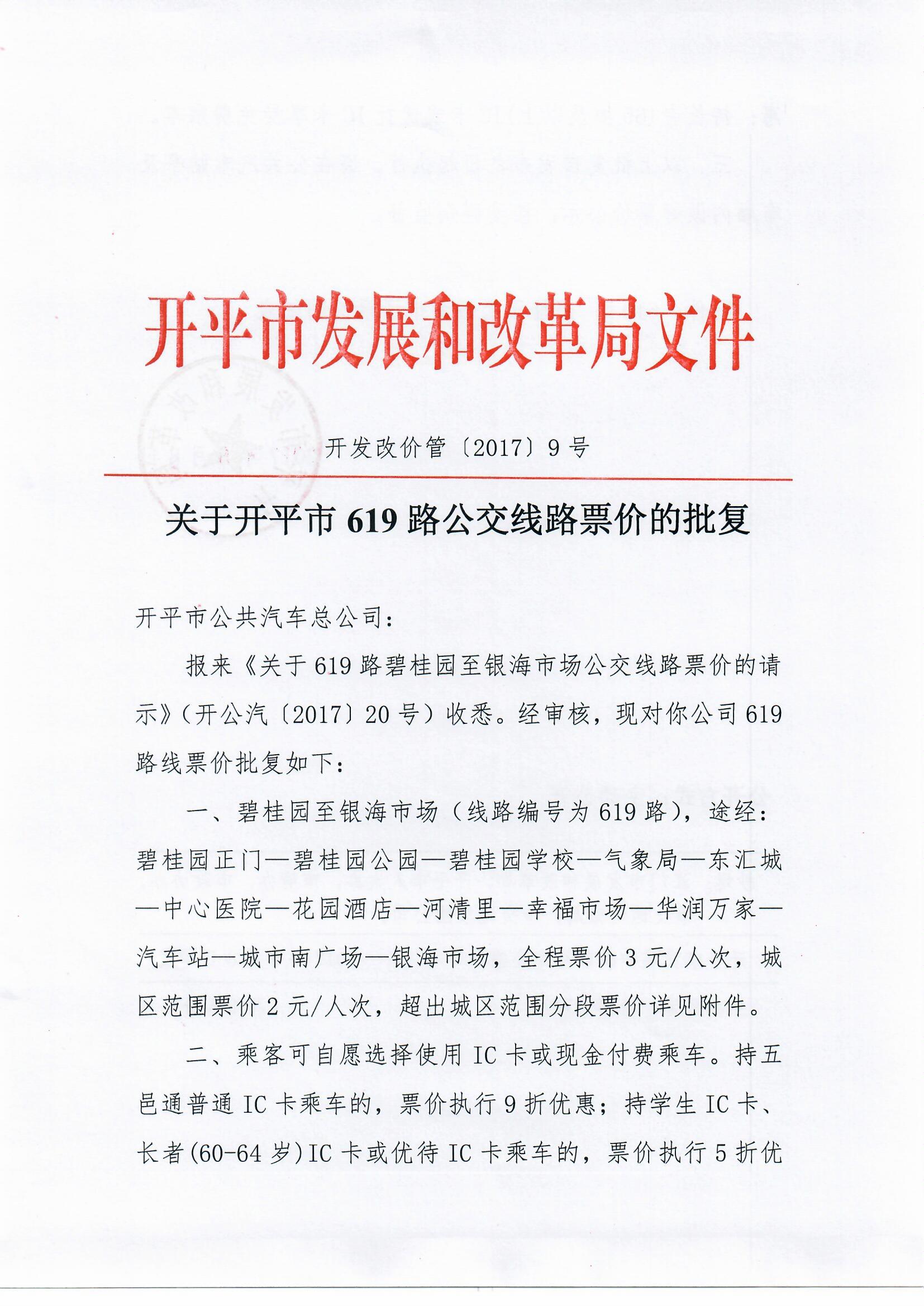 開發(fā)改價(jià)管〔2017〕9號(hào) 關(guān)于開平市619路公交線路票價(jià)的批復(fù)