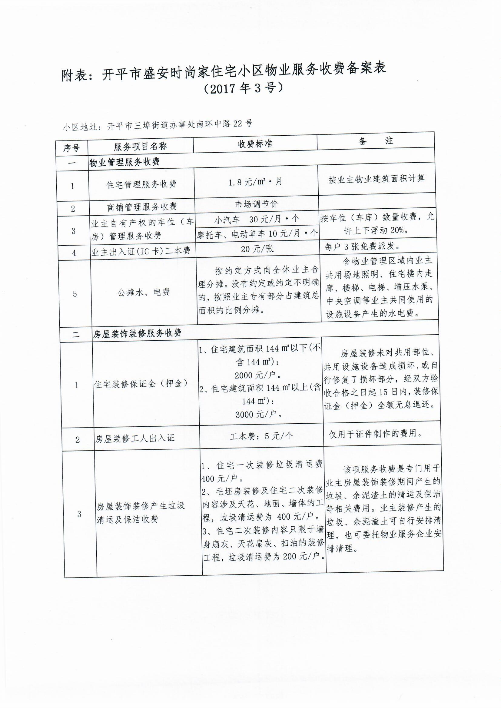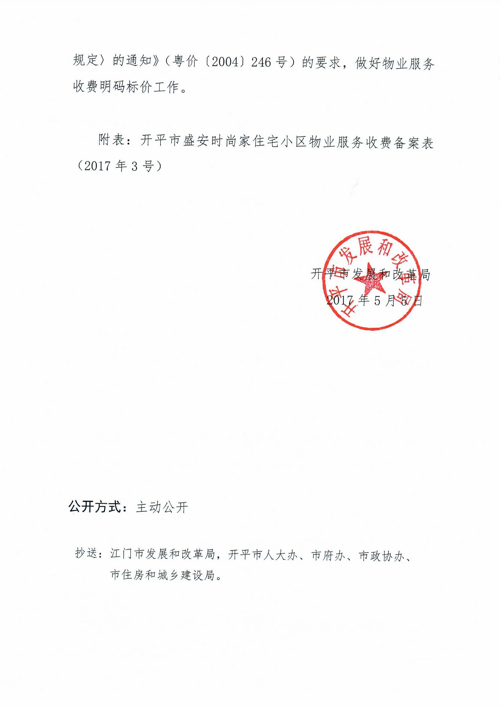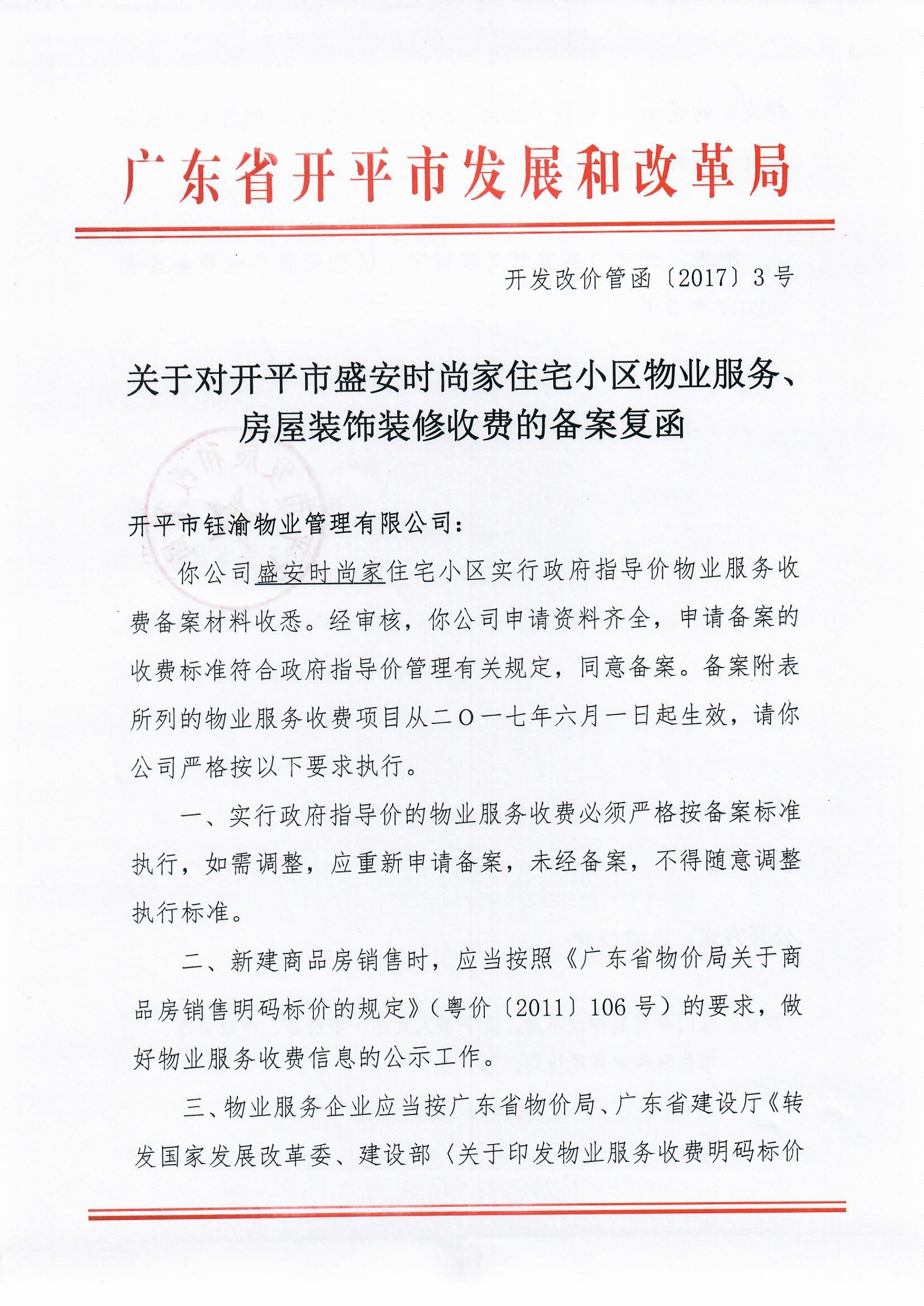 開發改價管函〔2017〕3號 關于對開平市盛安時尚家住宅小區物業服務、房屋裝飾裝修收費的備案復函