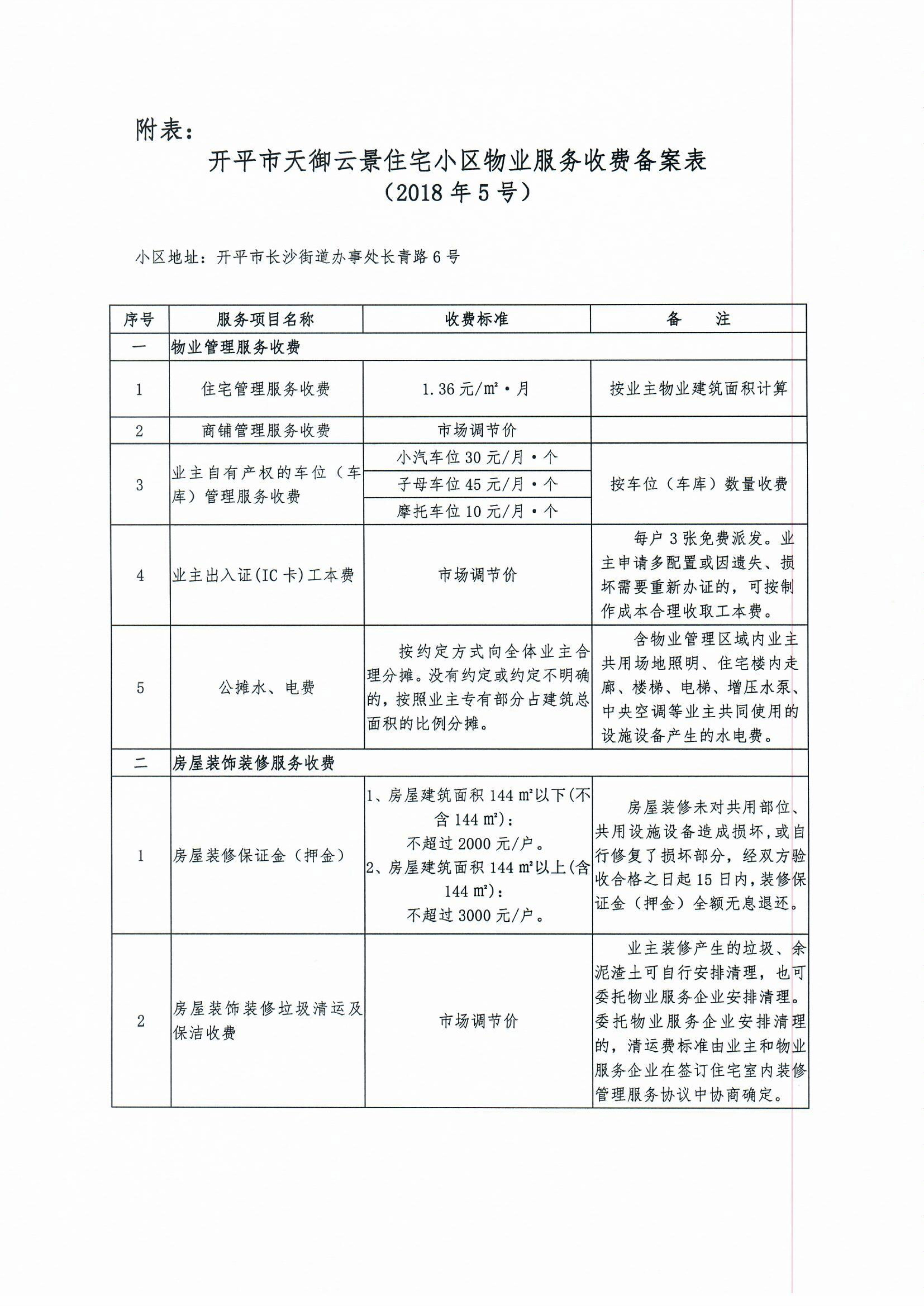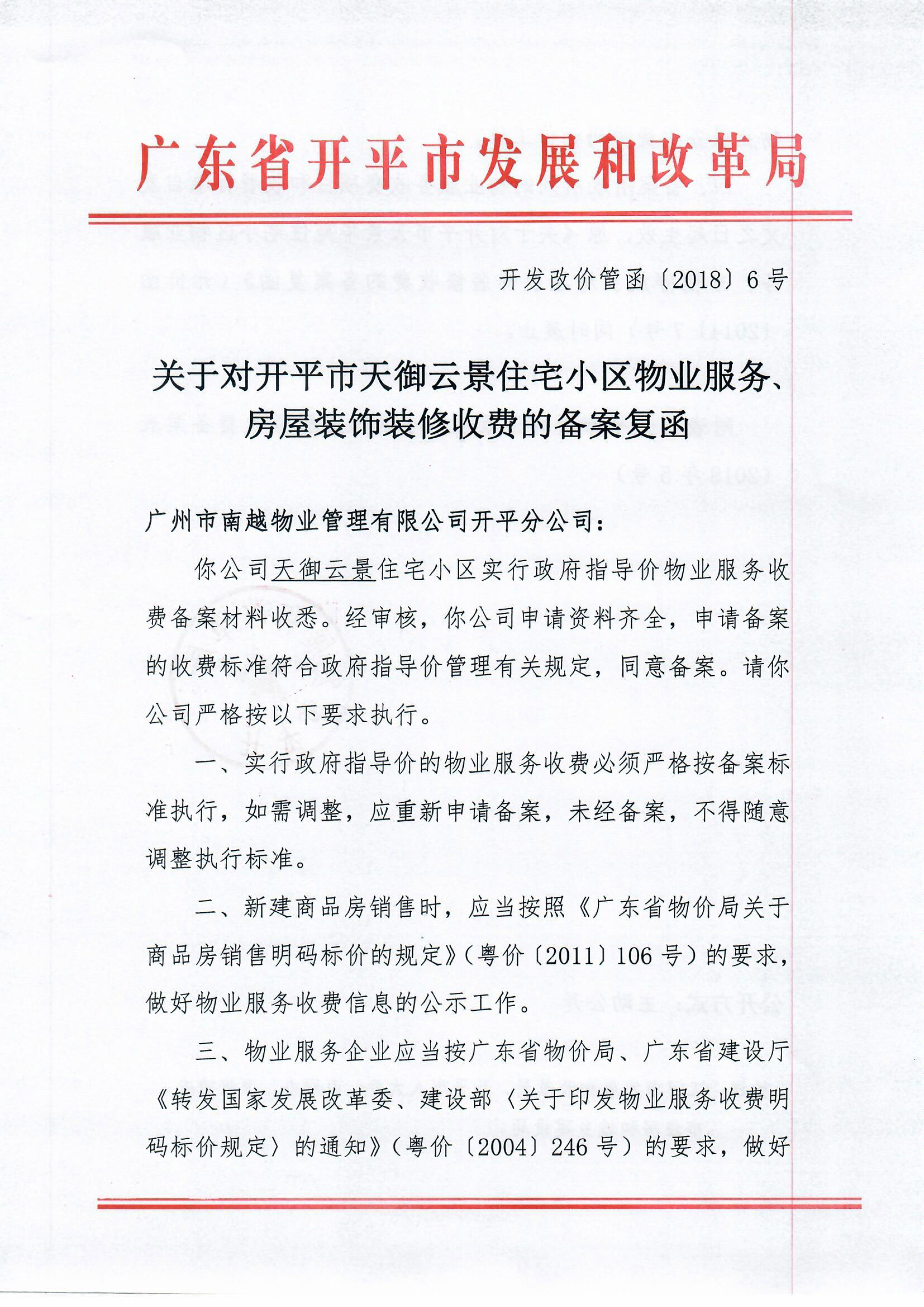 (開發改價管函〔2018〕6號)關于對開平市天御云景住宅小區物業服務、房屋裝飾裝修收費的備案復函