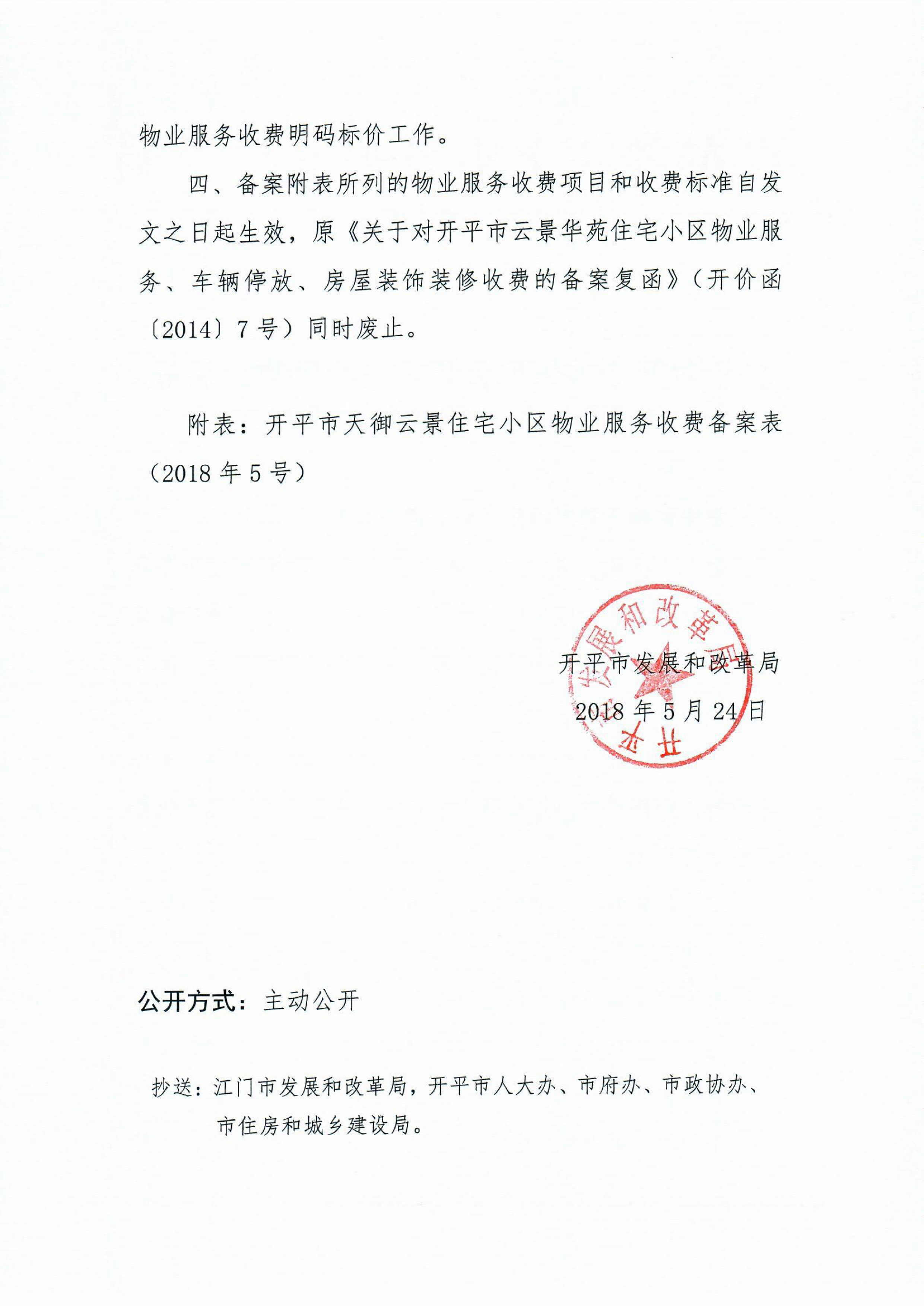 開發改價管函〔2018〕6號 關于對開平市天御云景住宅小區物業服務、房屋裝飾裝修收費的備案復函