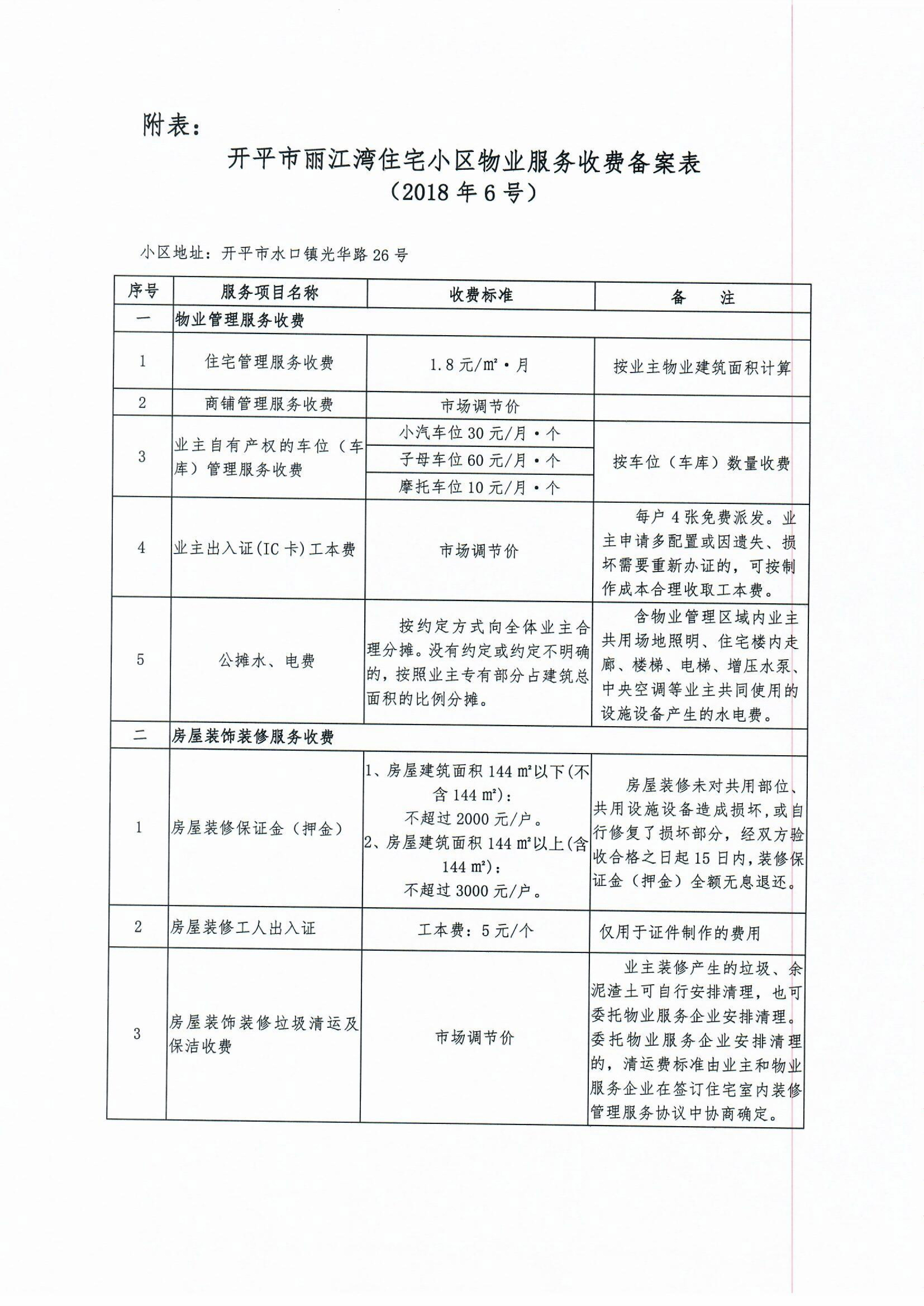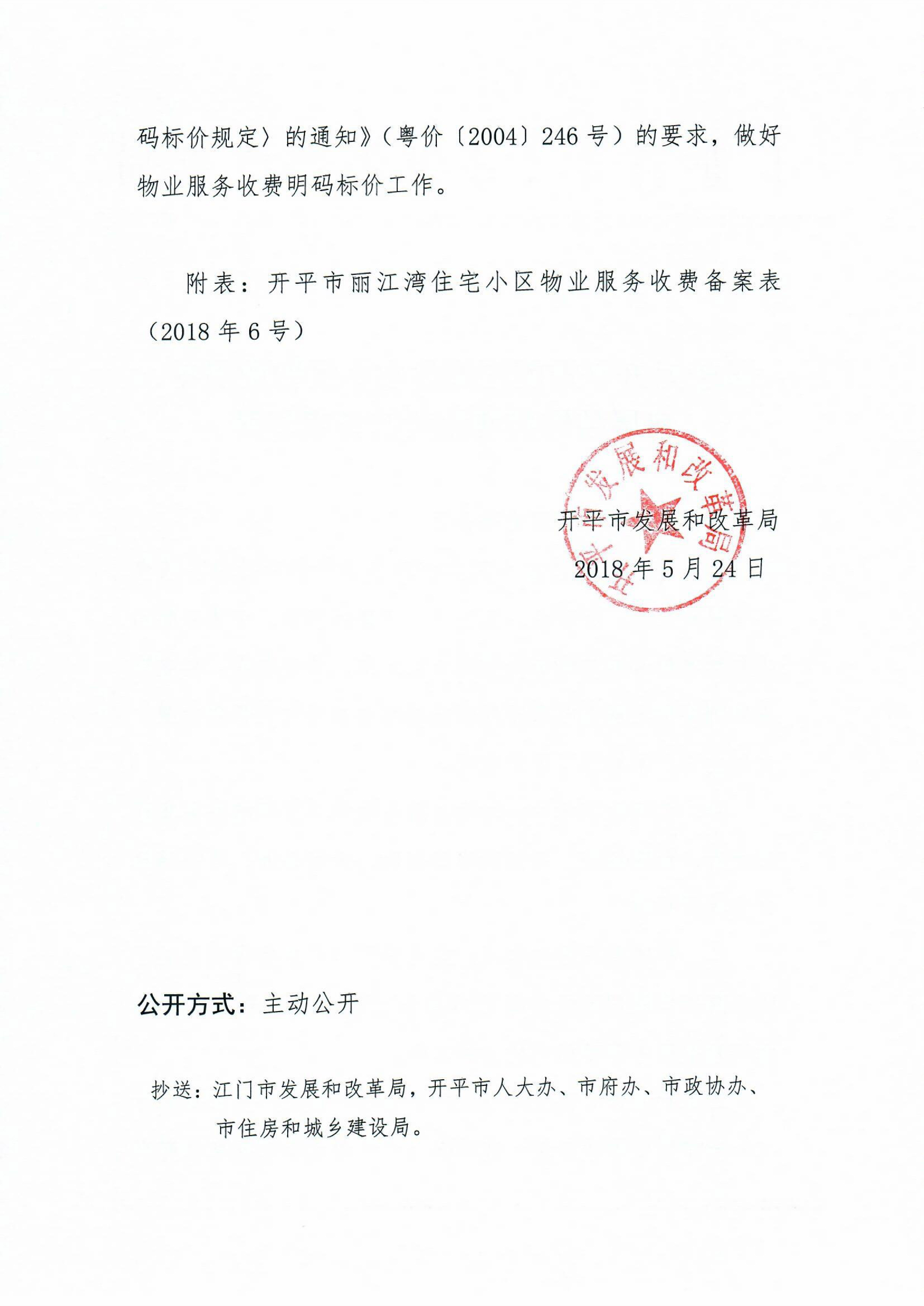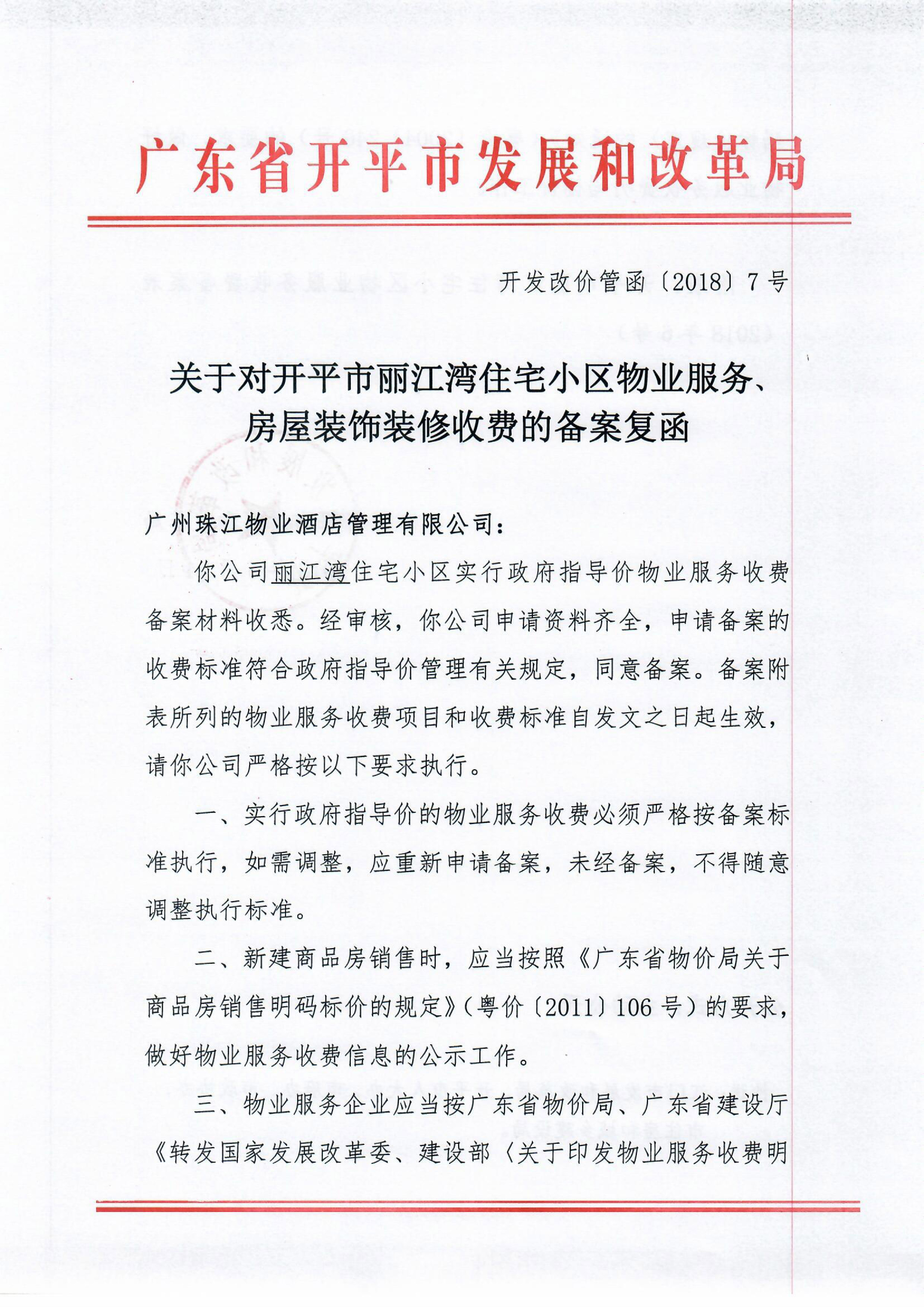 (開發改價管函〔2018〕7號)關于對開平市麗江灣住宅小區物業服務、房屋裝飾裝修收費的備案復函