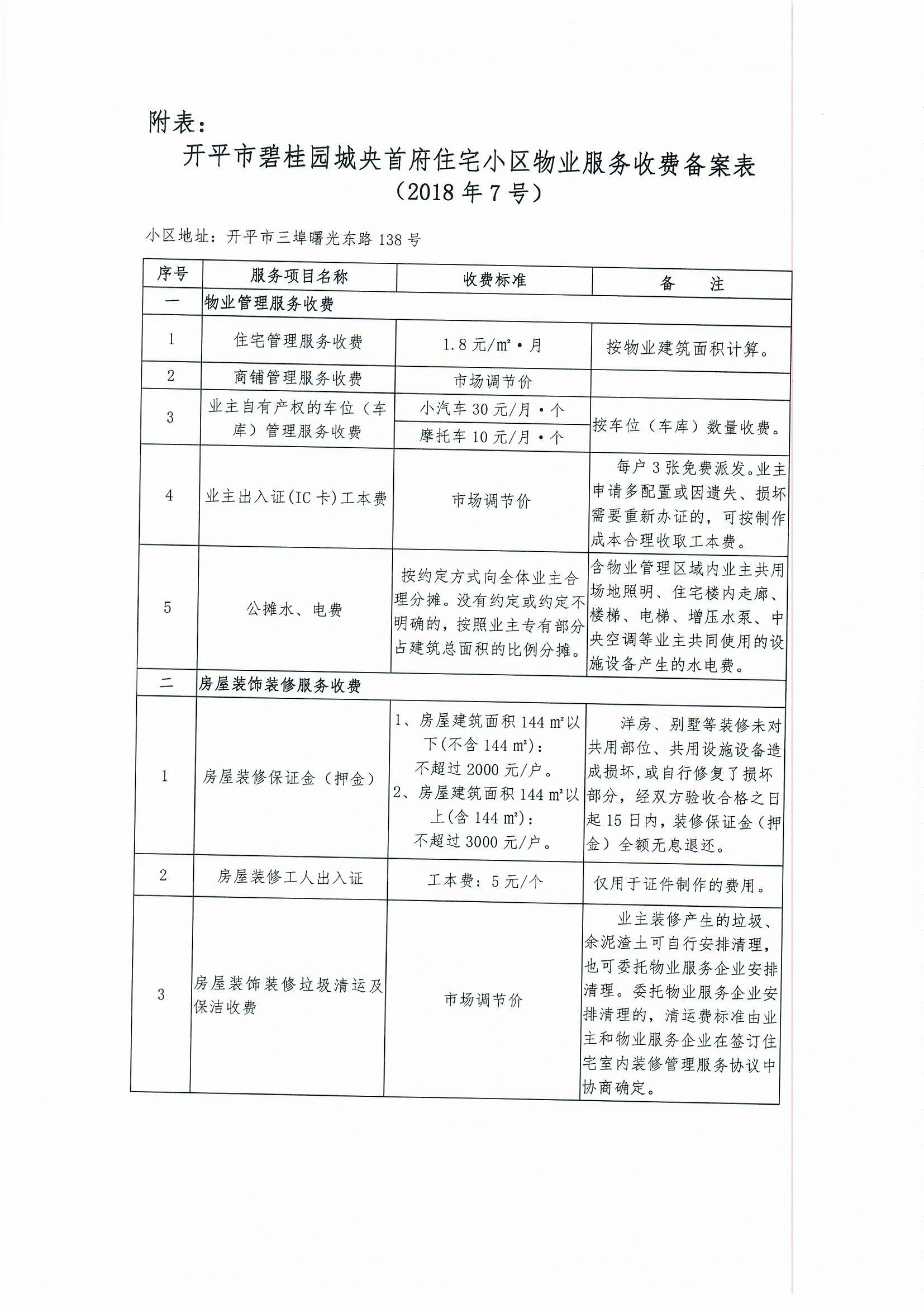 開發改價管函〔2018〕8號 關于對開平市碧桂園城央首府住宅小區物業服務、房屋裝飾裝修收費的備案復函
