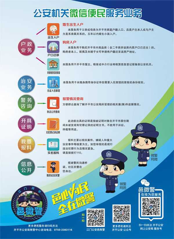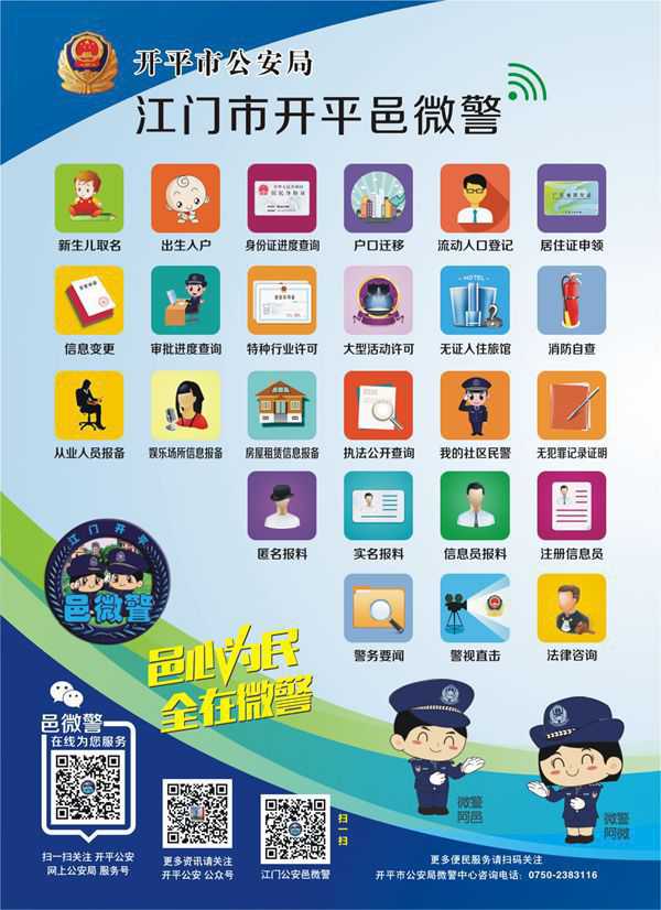 江門市開平邑微警是開平市公安局根據(jù)江門市公安局的統(tǒng)一部署通過微信平臺開通的網(wǎng)上公安局。