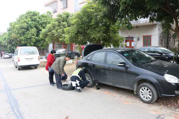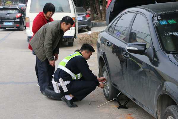 1月1日14時許,中隊民警在美食節現場周邊巡邏時,發現路邊停著一輛小車,司機及其家人圍著小車很是無奈和著急,于是上前了解情況。原來這一家人自駕參加美食節,游玩完后準備返程時卻發現汽車一輪胎沒氣,加上駕駛人不會換備胎,周邊也沒有換胎的修理店,心急如焚。民警了解情況后,安撫了駕駛人,主動拿出換輪胎工具,用千斤頂支起車身,幫助車主更換備胎,不到15分鐘就換好了輪胎。司機及其家人對交警熱心為民解憂十分感激,連聲道謝。