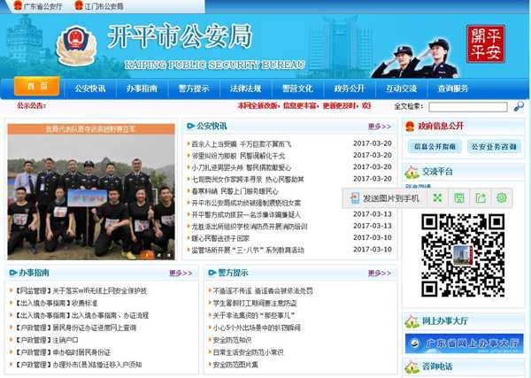 (五)強化創新,提升效能。年初,針對原有互聯網公安網站公開信息量少、范圍窄、民警互動性不強、為民服務功能弱的問題,我局抓住公安部開展“四項建設”社會管理創新的有利契機,對網站進行改版升級,完善網站各項功能,擴大公開范圍,提升服務效能。完善后的開平市公安局互聯網站內容更加完備,分為公安快訊、政務公開、辦事指南、安全防范、法律法規、機構概況、微薄、微信、在線訪談、網上警務室、警情通報、網上咨詢、便民服務、舉報投訴、交通違章查詢、二代身份證辦理進度查詢等板塊,包括本市治安、交通、消防等方面的總體情況、典型案例、防范提示及各類辦事表格下載等。