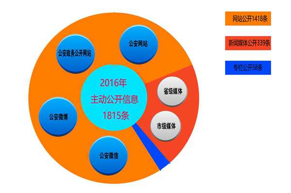 主動公開的途徑:一是網站公開。包含公安網站、公安政務公開網站、微信、微博等途徑,將重大工作動態、社會治安情況、行政審批服務、信息查詢、各類表格下載、預警防范提示等內容全部上網公開。二是新聞媒體公開。全年通過省、市各級媒體公開各類工作信息339條。三是專欄公開。在辦證大廳,巡警、交警、消防大隊,各派出所等大廳或門口設置專欄,公開有關辦事指南、行政審批事項、法律法規、轄區社會治安情況、派出所值班民警去向和聯系電話等情況。