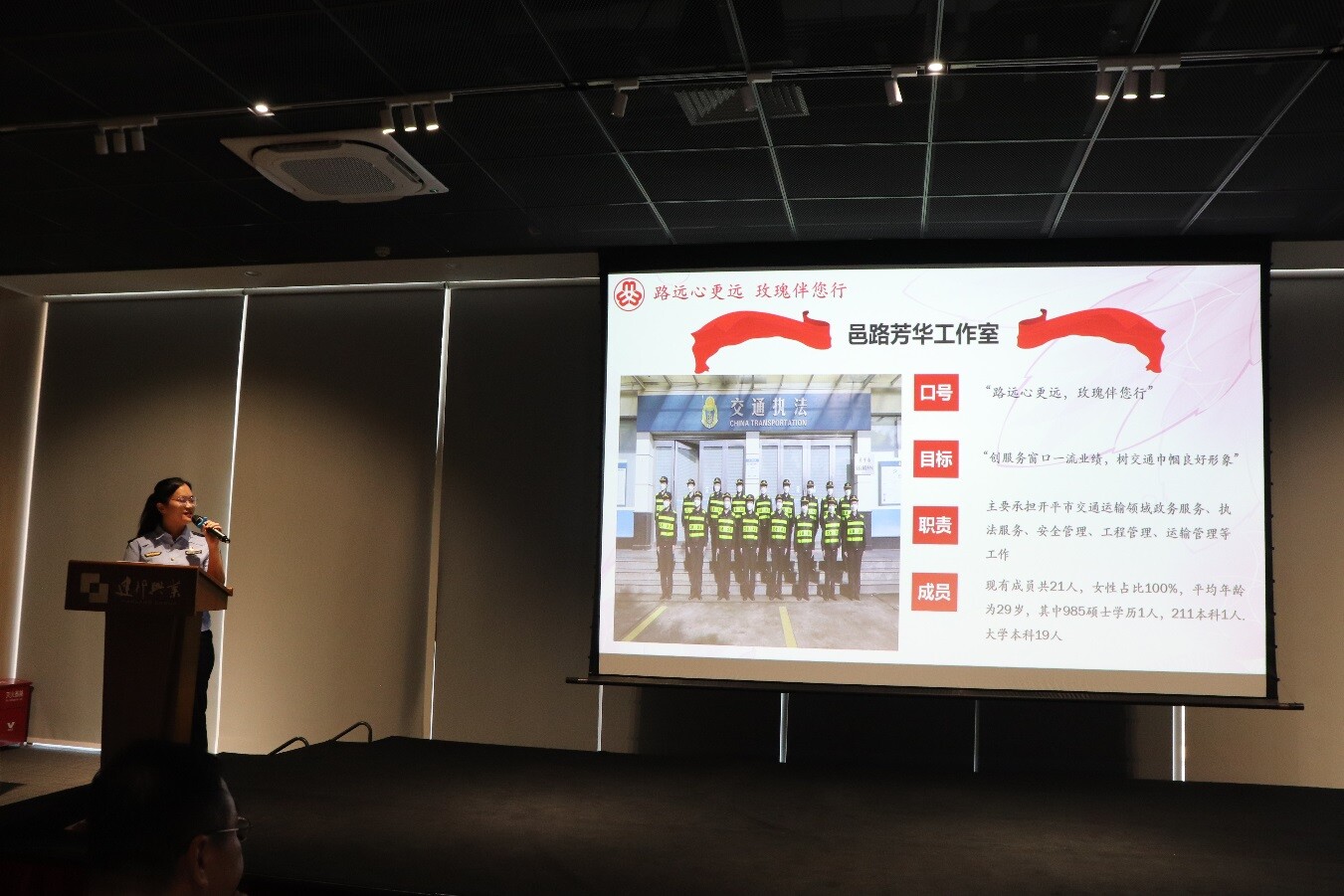 然后,“巾幗文明崗”成員駱妙嬋同志介紹了邑路芳華工作室概況,并詳細介紹了“巾幗文明崗”的創崗背景,講述開平市交通巾幗們立足本職崗位,爭先創優等工作中的感人事跡,展現巾幗“交通藍”的奉獻、擔當、創新以及砥礪深耕的新時代女性精神風貌。
