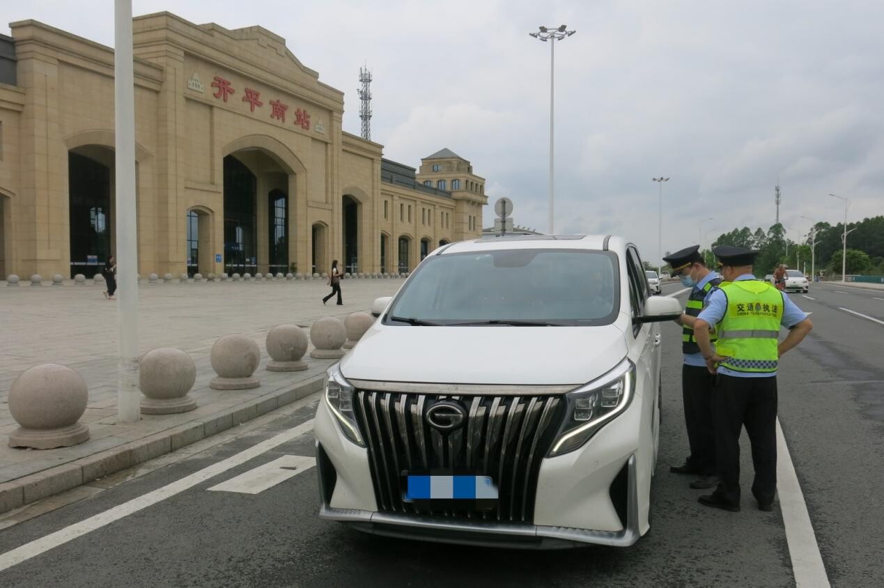 (執(zhí)法人員到開平南站嚴查非法營運、網(wǎng)約車無證運輸?shù)冗`法行為)