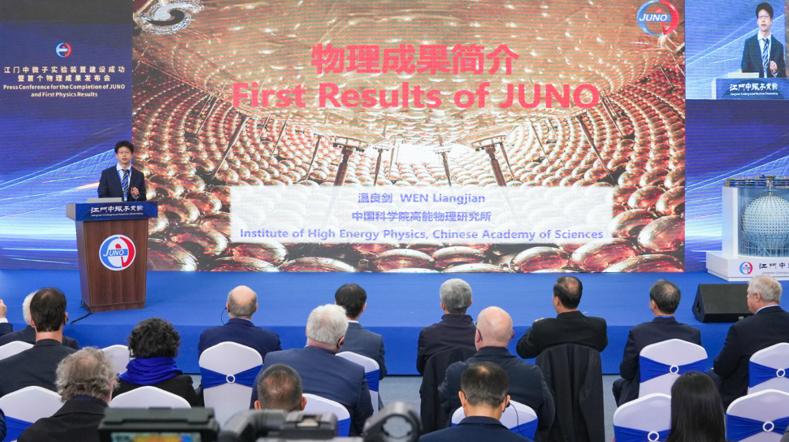 中國科學院高能物理研究所副所長、江門中微子實驗合作組物理分析負責人溫良劍報告江門中微子實驗的首個物理成果。