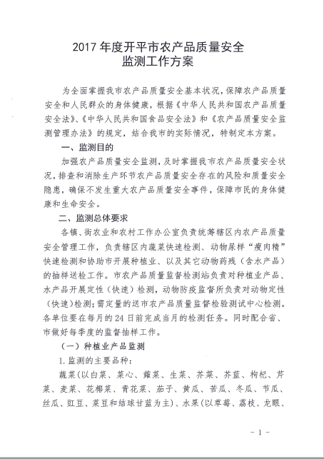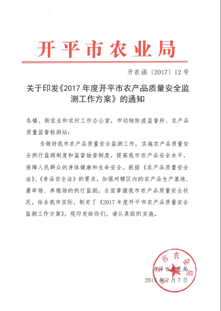 關于印發《2017年度開平市農產品質量安全監測方案》的通知