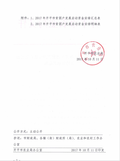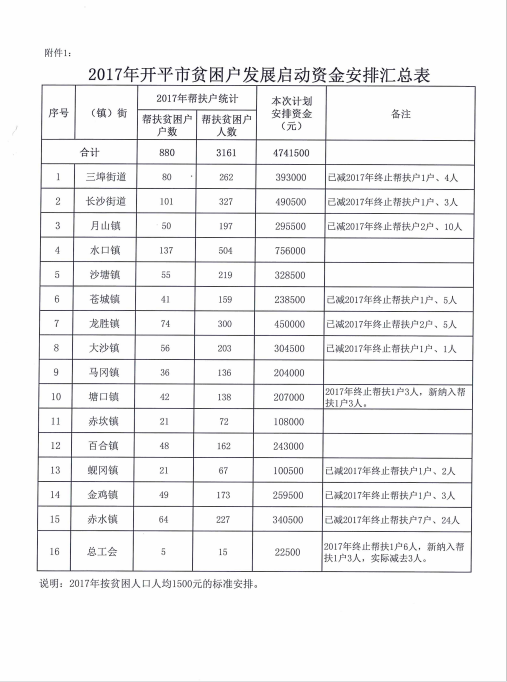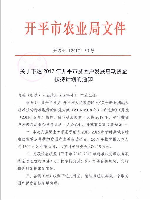 關于下達2017年開平市貧困戶發展啟動資金扶持計劃的通知