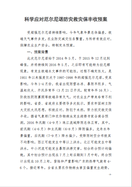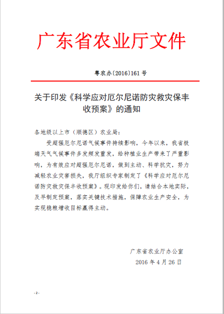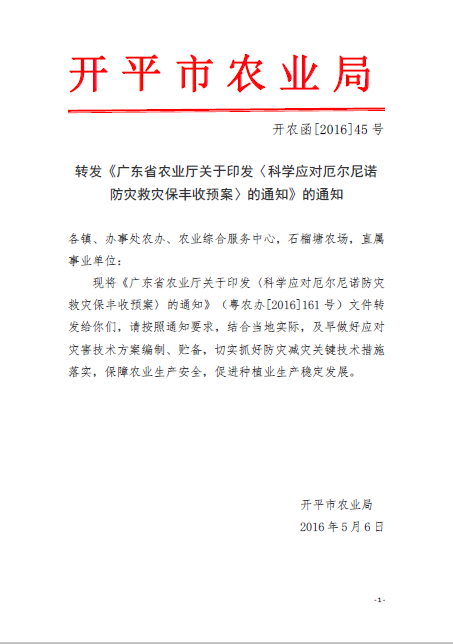 轉發《廣東省農業廳關于印發〈科學應對厄爾尼諾防災救災保豐收預案〉的通知》的通知(開農函[2016]45號)