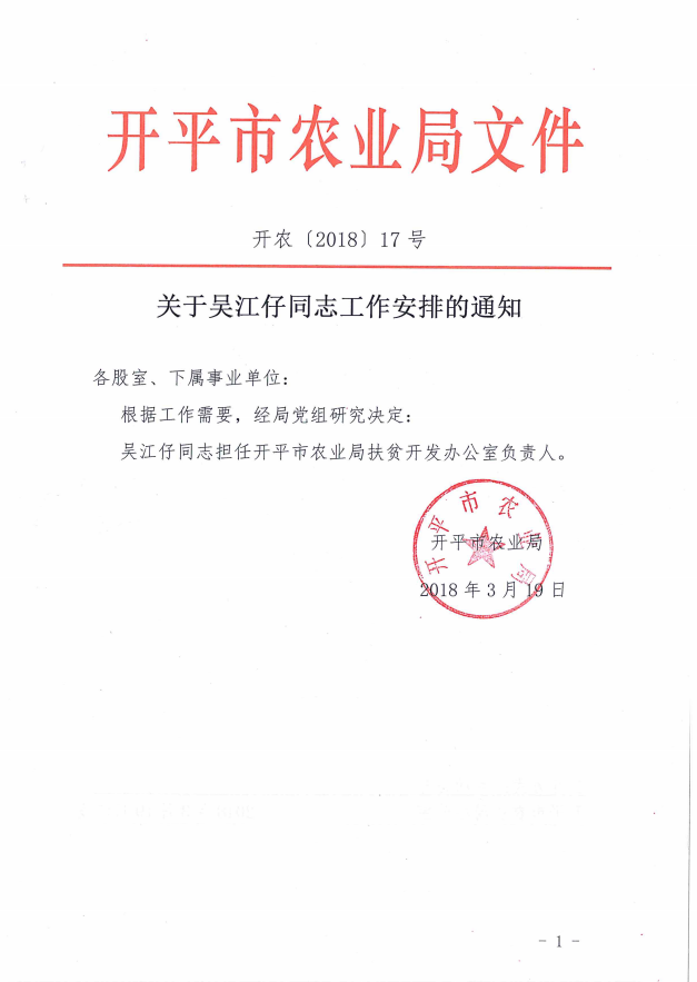 關(guān)于吳江仔同志工作安排的通知