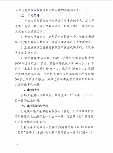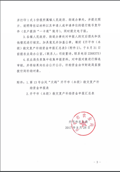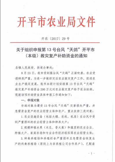 關于組織申報第13號臺風“天鴿”開平市(本級)救災復產補助資金的通知