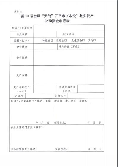 第13號臺風“天鴿”開平市(本級)救災復產補助資金申報表
