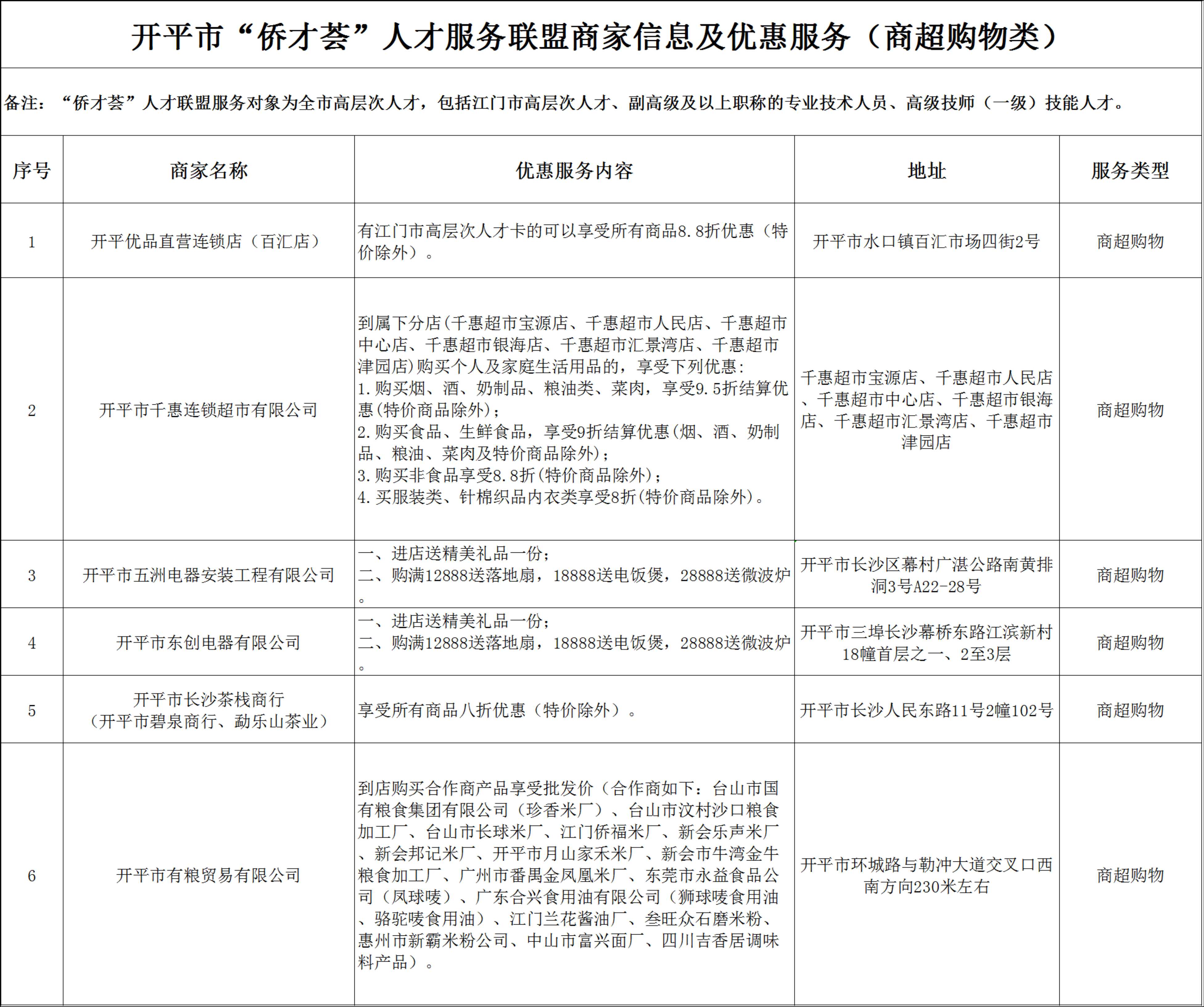 開(kāi)平市“僑才薈”人才服務(wù)聯(lián)盟商家信息及優(yōu)惠服務(wù)(商超購(gòu)物類(lèi))分表.xlsx