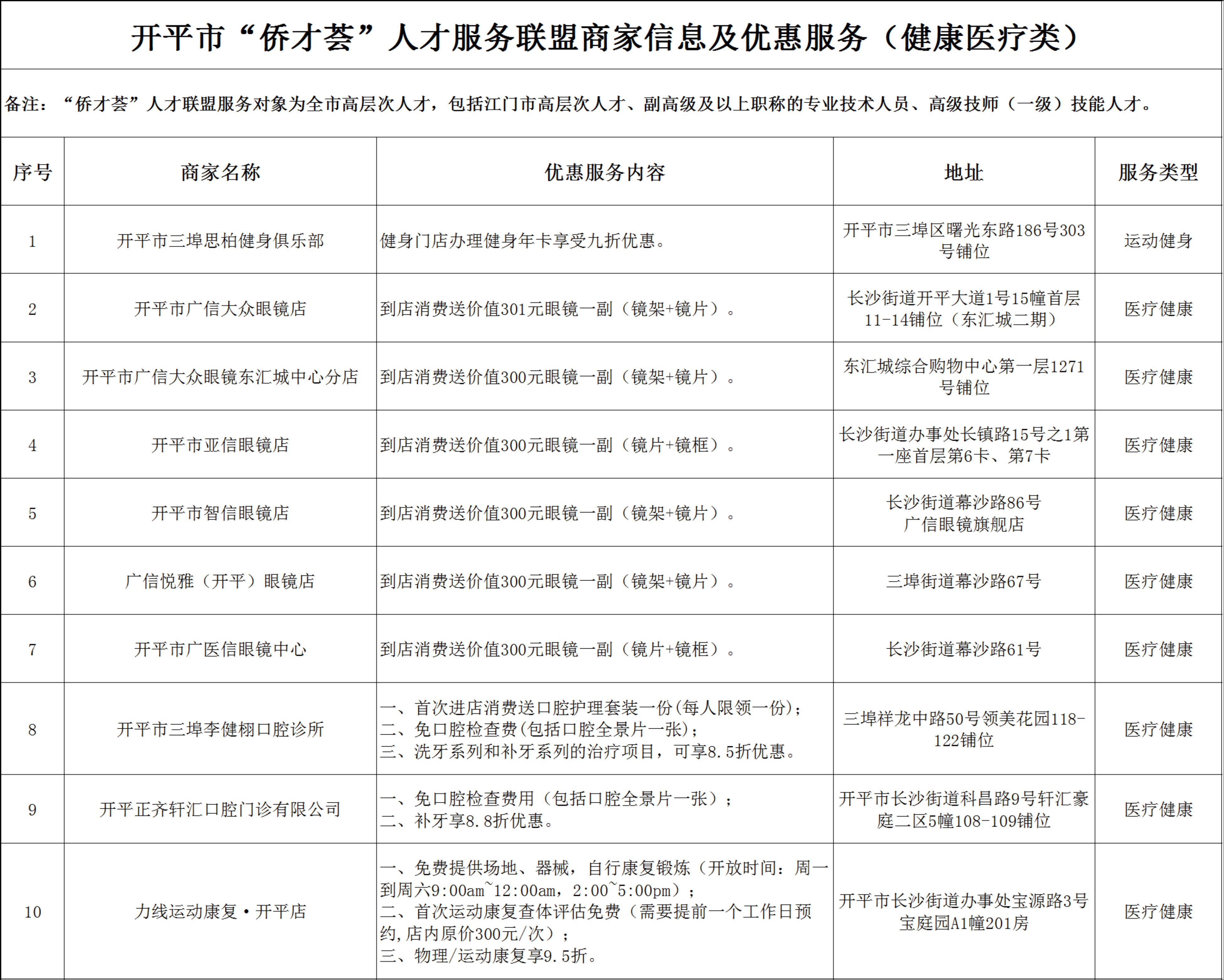 開(kāi)平市“僑才薈”人才服務(wù)聯(lián)盟商家信息及優(yōu)惠服務(wù)(健康醫(yī)療類(lèi))分表.xlsx