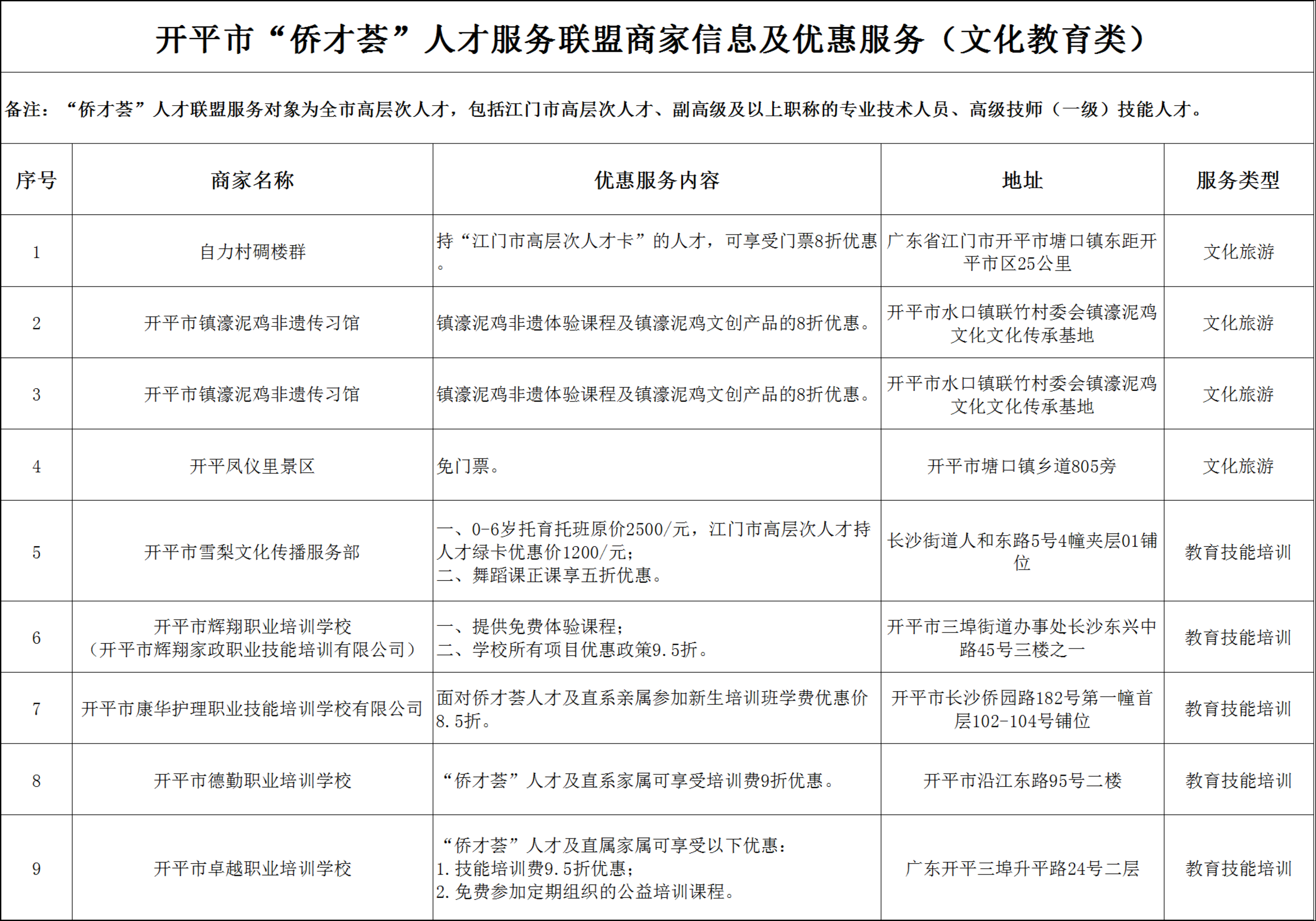 開(kāi)平市“僑才薈”人才服務(wù)聯(lián)盟商家信息及優(yōu)惠服務(wù)(文化教育類(lèi))分表.xlsx