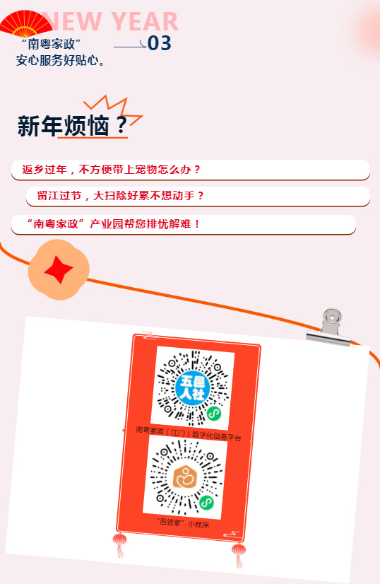 登錄南粵家政(江門)數字化信息平臺,上百家優質家政企業提供保潔、月嫂、育嬰、養老等全方位家庭服務。打開“邑管家”小程序,即可下單上門照顧寵物、上門代廚等新型家政服務,讓您度過舒心春節!