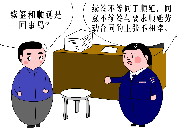 監察員了解情況后告訴他,續簽不等同于順延,公司對此的解釋是錯誤的。勞動合同順延是指勞動合同期滿時,由于法定順延事由的出現,導致勞動合同不能終止,需要依法順延至法定事由消失后,才可以終止;續簽是當期勞動合同終止后,重新簽訂一份勞動合同。因此,小郭同意不續簽,與其要求順延勞動合同的主張并不相悖。