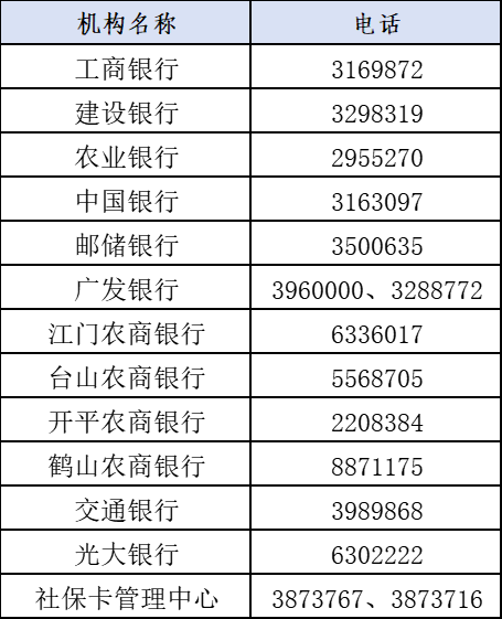 如有社保卡相關疑問,可致電江門社保卡管理中心或各社會保障卡合作銀行服務熱線咨詢: