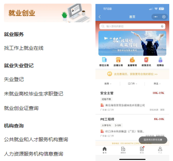 就業創業服務。可以線上瀏覽最新招聘信息,創建個人電子簡歷并投遞,辦理就業失業登記等業務,為您的就業創業路“保駕護航”。