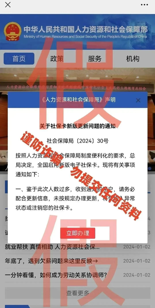 點擊鏈接跳轉到的頁面,與人力資源社會保障部官方網站的界面非常相似,但實際為不法分子偽造的詐騙網站。