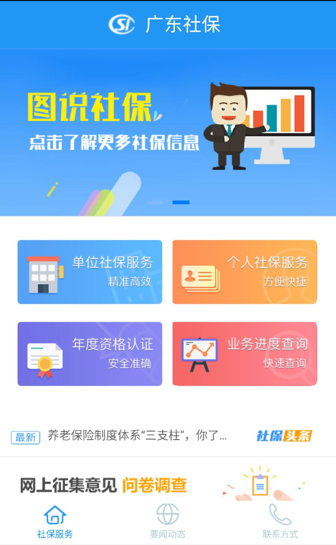 1.掃描二維碼下載“廣東社保”手機(jī)APP,打開APP,在社保服務(wù)欄目?jī)?nèi), 點(diǎn)擊“個(gè)人年度資格認(rèn)證” 按鈕, 進(jìn)入服務(wù)界面。