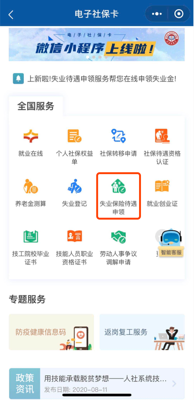 關于【失業登記】 Q 哪些人可以辦理失業登記? 所有勞動年齡內、有勞動能力、有就業需求、處于無業狀態的城鄉勞動者均可以進行失業登記。 例如,從各類學校畢業肄業的學生、與企業解除或終止勞動關系的勞動者、承包土地被征用的農民、從事一定收入的勞動但月收入低于當地最低生活保障標準的人員等。 Q 失業登記怎么辦理? 1 進入【國務院客戶端小程序】→【電子社保卡】→【查看電子社保卡信息】。 2 點擊失業登記,填寫申請人基本信息、失業相關信息和求職相關信息。 3 在【全國服務】→【更多】→【失業登記審核結果】中,可查詢之前提交申請的審核結果。 關于【失業保險待遇申領】 Q 哪些人可以領失業保險金、失業補助金? 失業保險金: 按規定參加失業保險,所在單位和本人已履行繳費義務滿1年、非本人意愿中斷就業、已辦理失業登記并有求職要求的失業人員。 失業補助金: ● 按規定參加失業保險,所在單位和本人已履行繳費義務不足1年的失業人員, ● 參保繳費滿1年但因個人原因解除勞動合同的失業人員, ● 領取失業保險金期滿仍未就業的失業人員。 Q 失業保險金、補助金怎么申領? 1 進入【國務院客戶端小程序】→【電子社保卡】→【查看電子社保卡信息】。 2 點擊失業保險待遇申領,查詢所申領參保地是否開通失業保險金或失業補助金網上申領服務。目前全國所有省(區、市)失業保險金和失業補助金均已開通統一申領服務。 3 凡已開通服務的地區,可以點擊失業保險金或失業補助金“去申請”按鈕,核實或錄入參保地、銀行賬號等信息,就能完成申請。 4 點擊失業保險金或失業補助金“查看詳情”按鈕,可以查詢申請的審核結果。經核查符合申領條件的,就可以通過登記的銀行賬戶領到失業保險待遇啦。 掃描或點擊下方小程序碼, 領失業保險金、失業補助金