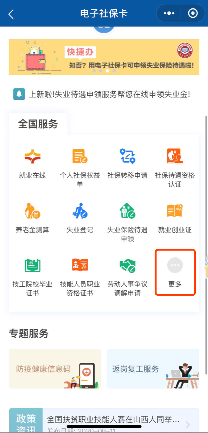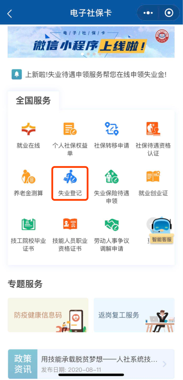 關于【失業登記】 Q 哪些人可以辦理失業登記? 所有勞動年齡內、有勞動能力、有就業需求、處于無業狀態的城鄉勞動者均可以進行失業登記。 例如,從各類學校畢業肄業的學生、與企業解除或終止勞動關系的勞動者、承包土地被征用的農民、從事一定收入的勞動但月收入低于當地最低生活保障標準的人員等。 Q 失業登記怎么辦理? 1 進入【國務院客戶端小程序】→【電子社保卡】→【查看電子社保卡信息】。 2 點擊失業登記,填寫申請人基本信息、失業相關信息和求職相關信息。 3 在【全國服務】→【更多】→【失業登記審核結果】中,可查詢之前提交申請的審核結果。 關于【失業保險待遇申領】 Q 哪些人可以領失業保險金、失業補助金? 失業保險金: 按規定參加失業保險,所在單位和本人已履行繳費義務滿1年、非本人意愿中斷就業、已辦理失業登記并有求職要求的失業人員。 失業補助金: ● 按規定參加失業保險,所在單位和本人已履行繳費義務不足1年的失業人員, ● 參保繳費滿1年但因個人原因解除勞動合同的失業人員, ● 領取失業保險金期滿仍未就業的失業人員。 Q 失業保險金、補助金怎么申領? 1 進入【國務院客戶端小程序】→【電子社保卡】→【查看電子社保卡信息】。 2 點擊失業保險待遇申領,查詢所申領參保地是否開通失業保險金或失業補助金網上申領服務。目前全國所有省(區、市)失業保險金和失業補助金均已開通統一申領服務。 3 凡已開通服務的地區,可以點擊失業保險金或失業補助金“去申請”按鈕,核實或錄入參保地、銀行賬號等信息,就能完成申請。 4 點擊失業保險金或失業補助金“查看詳情”按鈕,可以查詢申請的審核結果。經核查符合申領條件的,就可以通過登記的銀行賬戶領到失業保險待遇啦。 掃描或點擊下方小程序碼, 領失業保險金、失業補助金