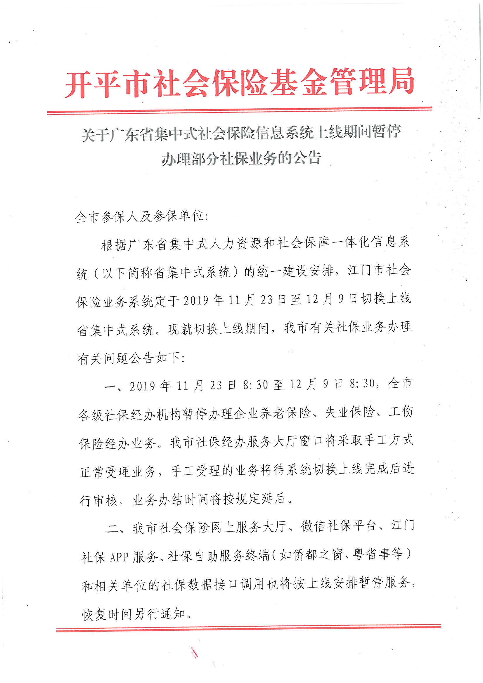 關于廣東省中式社會保險信息系統上線期間暫停辦理部分社保業務的公告
