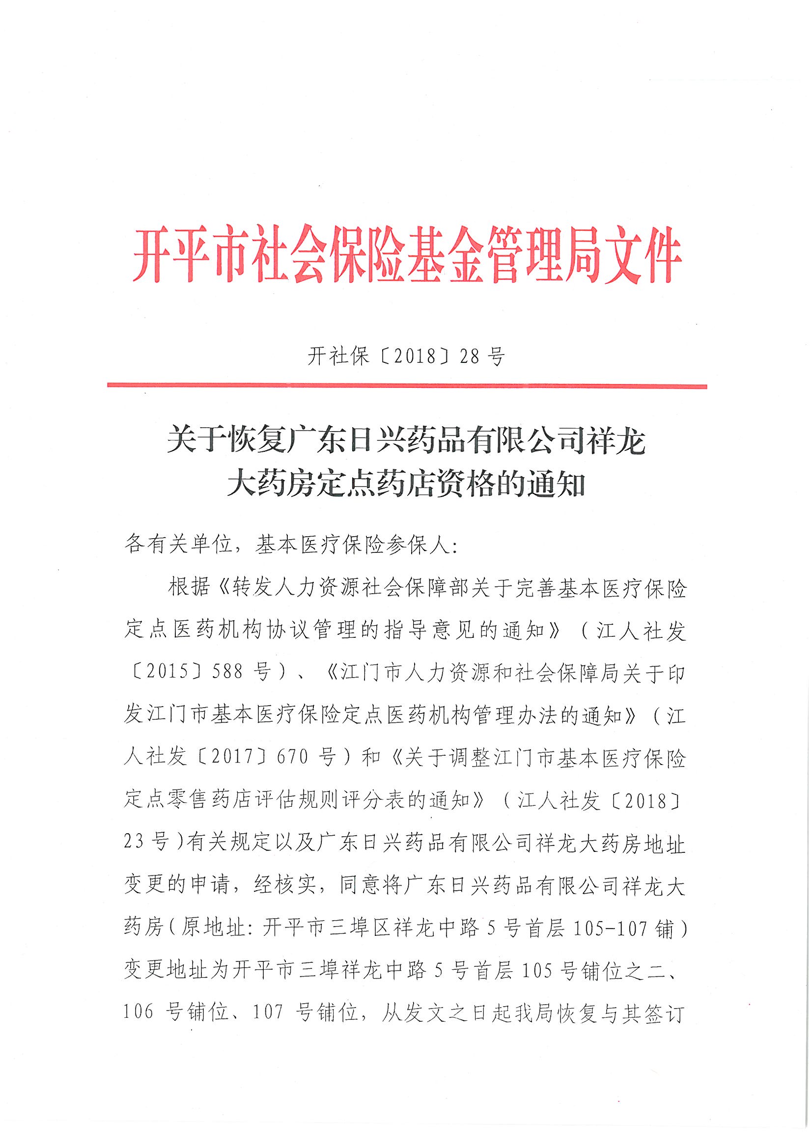 關于恢復廣東日興藥品有限公司祥龍大藥房定點藥店資格的通知