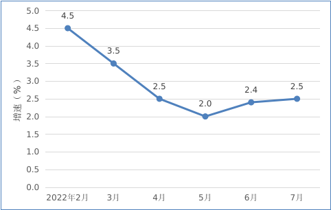 2022年2月以來我市規(guī)模以上工業(yè)增加值情況 二、投資 1-7月,全市完成固定資產(chǎn)投資同比下降12.8%。從分經(jīng)濟(jì)類型看,國有投資增長38.6%;民間投資下降16.3%。分產(chǎn)業(yè)看,第一產(chǎn)業(yè)投資下降48.9%;第二產(chǎn)業(yè)投資增長下降3.9%,其中工業(yè)投資下降3.9%;第三產(chǎn)業(yè)投資下降17.1%,其中房地產(chǎn)投資下降27.8%。 三、消費(fèi)市場 1-7月,我市完成社會(huì)消費(fèi)品零售總額100.87億元,同比增長2.5%。 圖二