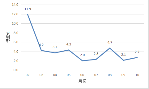 開平市1-10月經濟運行簡況 1-10月,全市主要經濟指標運行簡況如下: 一、工業生產 1-10月,開平規模以上工業企業累計完成工業增加值105.92億元,同比增長2.7%。 分經濟類型看,股份制企業增長2.2%;外商及港澳臺商投資企業增長3.0%;私營企業增長2.1%。分門類看,采礦業增加值增長17.8%,制造業增加值增長2.8%,電力、熱力、燃氣及水生產和供應業增加值下降8.6%。 1-10月全市工業用電量下降6.1%。 圖一