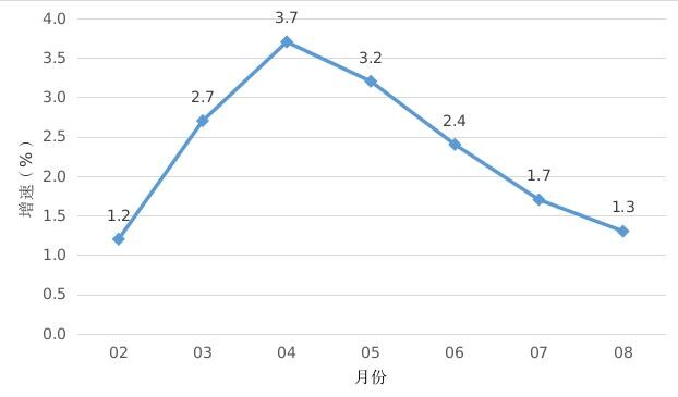 2023年1-8月開平市經濟運行簡況 1-8月,全市主要經濟指標運行簡況如下: 一、工業生產 1-8月,開平規模以上工業企業累計完成工業增加值87.34億元,同比增長3.5%。 分經濟類型看,股份制企業增長5.4%;外商及港澳臺商投資企業增長2.0%;私營企業增長3.8%。分門類看,采礦業增加值增長12.7%,制造業增加值增長3.5%,電力、熱力、燃氣及水生產和供應業增加值下降0.3%。 1-8月全市工業用電量增長3.2%。 圖一 2023年2月以來開平市規模以上工業增加值增速 二、投資 1-8月,全市完成固定資產投資同比下降11.5%。從分經濟類型看,國有投資下降24.8%;民間投資下降14.2%。分產業看,第一產業投資下降22.1%;第二產業投資增長13.9%,其中工業投資增長13.9%;第三產業投資下降31.6%,其中房地產投資下降15.5%。 三、消費市場 1-8月,我市完成社會消費品零售總額119.70億元,同比增長1.3%。 圖二 2023年2月以來開平市社會消費品零售總額增速 四、財政收入 1-8月,全市實現地方一般公共預算收入17.26億元,同比下降11.1%,其中稅收收入10.45億元,同比增長12.5%。 五、金融市場 1-8月,全市金融機構本外幣各項存款余額898.73億元,同比增長12.3%;本外幣各項貸款余額646.92億元,同比增長18.3%。全市金融機構人民幣各項存款余額880.40億元,同比增長12.8%;人民幣各項貸款余額644.90億元,同比增長18.1%。 六、外貿進出口 1-8月,全市外貿進出口總額99.8億元,同比下降12.3%。其中,進口8.0億元,同比下降9.9%;出口91.8億元,同比下降12.5%。 2023.9.28